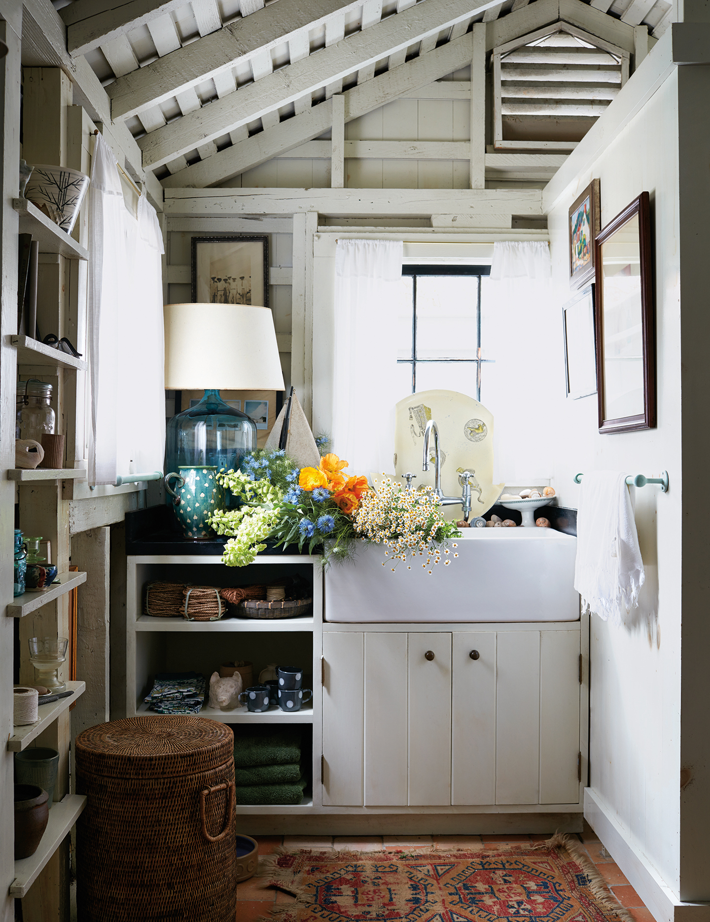 Designers Dan Fink and Thomas O’Brien added new shiplap fronts to the cabinets in their Bellport, New York, cottage to cover up plumbing, but you’d never know. In a soft white, the grooved doors feel right at home with the farmhouse sink and vaulted ceiling’s exposed beams, painted a similar shade.