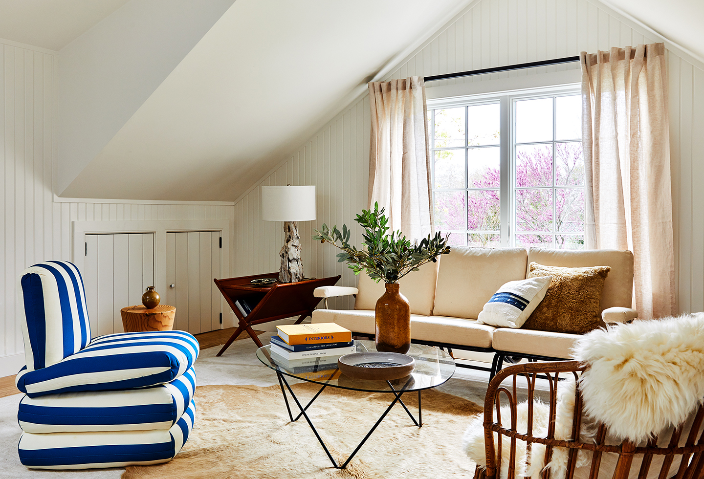 “A lot of sleep was lost over the wall treatment,” says Feirstein of the wainscoting, shiplap, and board-and-batten details. It runs halfway up the walls in some rooms. In others, it’s applied overhead. In the cavernous main bedroom, though, it stretches floor to ceiling, disguising awkward rooflines and bringing a sense of history to the new addition. A built-in bench, also paneled, is a cozy spot for breakfast—and cleverly hides ductwork. With all of these updates, Feirstein was able to almost double the property value in just two years.