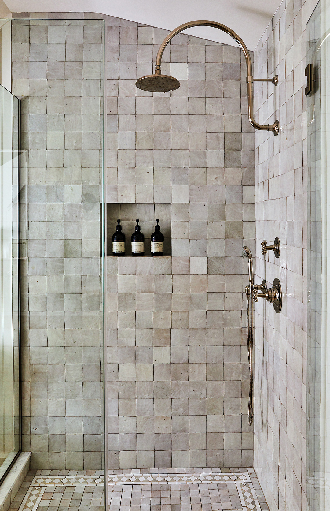 Other design decisions in the bathrooms came down to availability—due to COVID, there was a material shortage. The downstairs guest bath ended up with green-black zellige tile in the shower, while the primary bath got a light gray mosaic. “I wanted the guest suite to feel separate,” notes Feirstein. Butter-hued beadboard walls and unlacquered brass fixtures offset the moody stall; the adjoining bedroom’s palette is a play on the same colors, only flipped. Upstairs, cooler-toned nickel hardware and white paneling feels similar but airier.