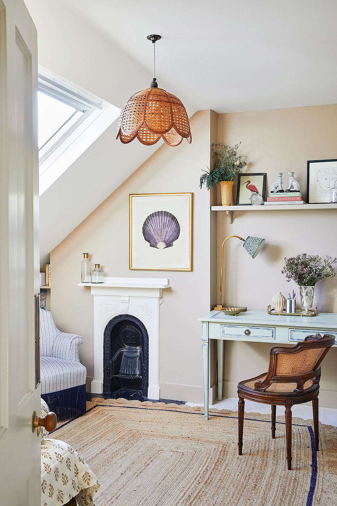 Laura searched high and low for an antique desk, but time was of the essence, so she asked the team at Scumble Goosie to paint its Empire piece in Teresa’s Green by Farrow & Ball, a pale green hue that gave it that old-school look. It fits the alcove perfectly and functions as a dressing table when guests stay. There’s no wardrobe, but a hook on the door can be laden with hangers for her mother to unpack. “It feels really quite special and sweet in here,” says Laura, who stocked the simple shelf above it with personal keepsakes. “So much so that it’s almost wasted on my husband—somehow I’m the one who has ended up working from the kitchen table!”