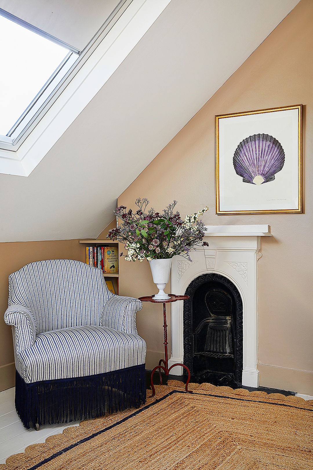 Laura knew instinctively that she wanted to use Smoked Trout by Farrow & Ball from floor to ceiling. “Going white with woodwork can be a distraction for the eyes and create the illusion of stripes in such a small space,” she explains. This dark mushroom tone, however, doesn’t create any unwanted shadows. She applied it just about everywhere, including the skirting board, door, and architraves. The only thing she did paint white is the fireplace, “because I wanted that to stand out as a feature,” she says. The navy border of the scalloped jute rug recalls the tasseled trim of the small antique chair, creating a cohesive look.