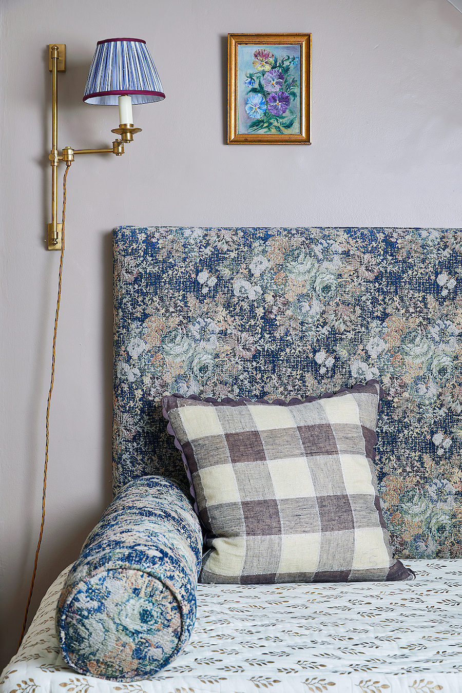 In order to comfortably fit a desk and chair, a pull-out bed was the only option. Laura bought a basic double daybed and dressed it with tonal soft textiles, including a custom-made linen valance, an Indian block-print quilt, and an abundance of cushions. What really anchors it is the headboard, which was made by a local upholsterer from plywood (and clad in fabric from Mulberry Home) and is angled into the sloping wall. Matching bolsters at each end create the illusion of a proper sofa.