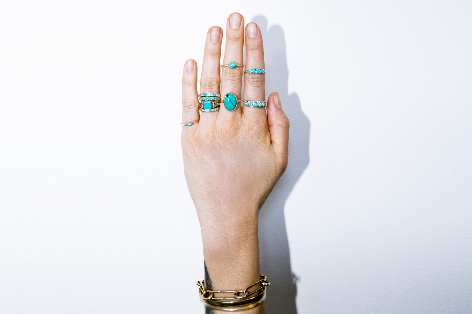 “Turquoise and diamond set in yellow gold—super understated elegance. People have a very casual attitude toward turquoise, but it’s actually very fragile. You have to be careful when you’re wearing it. It scratches and can break super easily.”