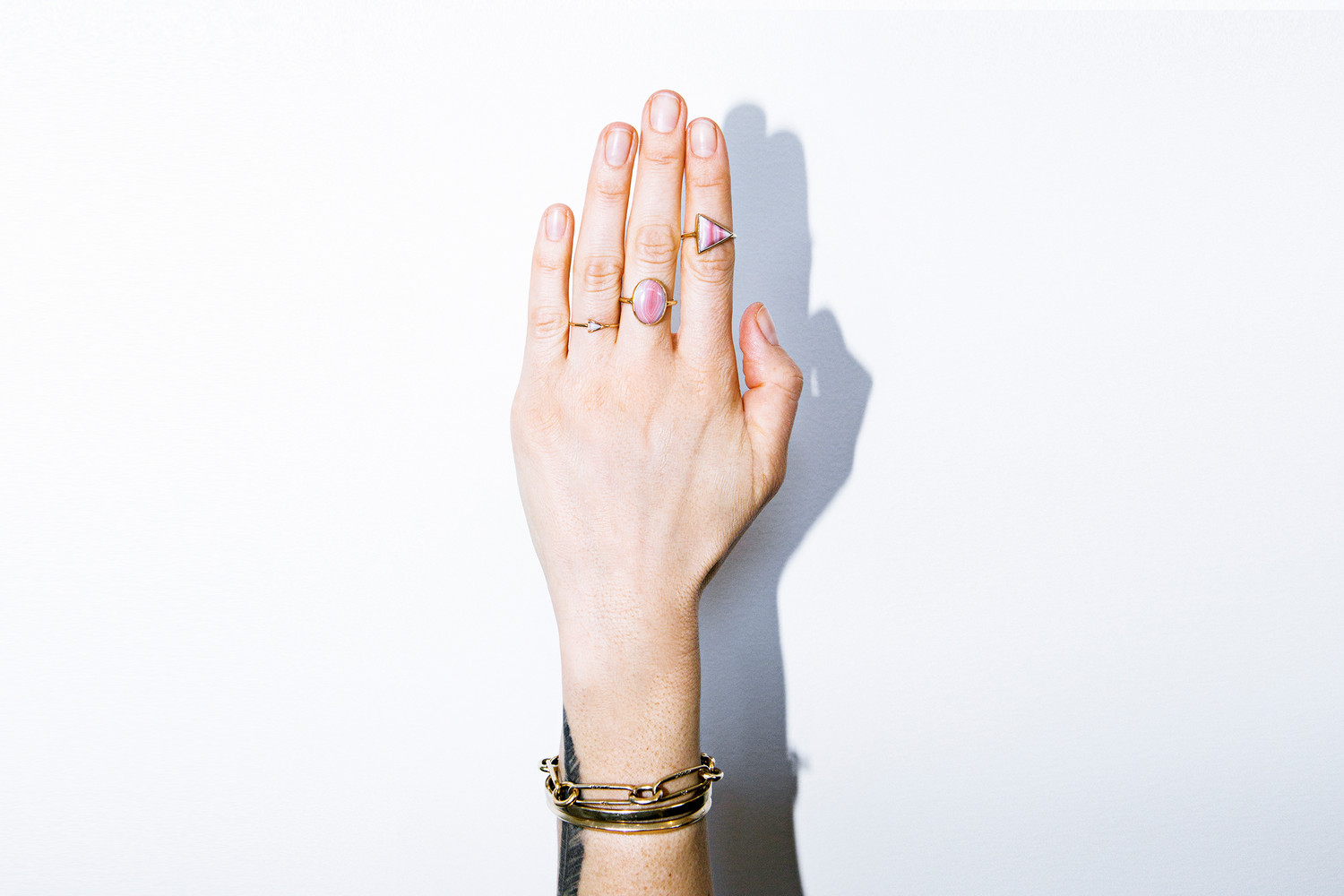 “Every time I look for stones, I find something that excites me,” says Brooklyn-based jewelry designer Caitlin Mociun, best known for her asymmetrical colored cluster rings. “I always discover a color or growth pattern from nature that amazes me. Lately, I’ve been obsessed with spinel—it’s a clear, often un-included, stone that comes in many colors, I love it in shades of lavender and grey and mauve.”