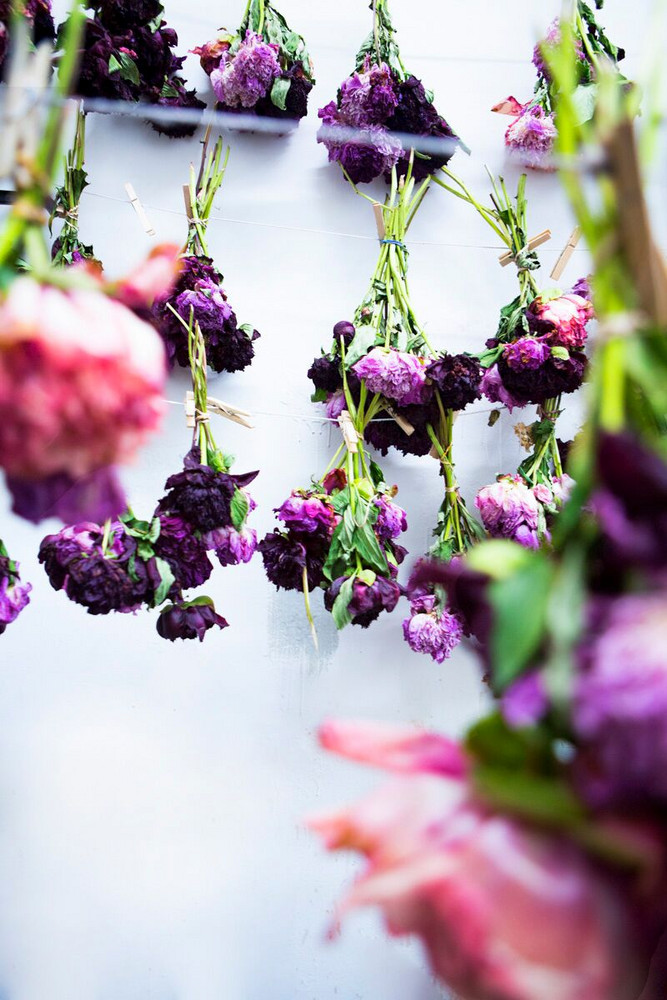 I love working with roses— they’re so potent. I’m a flower junkie. Ranunculus and anemones are some of my favorites. Recently, I dip dyed a huge Cortana tutu skirt light lavender ombre for a Stone Fox Bride client to use as her wedding gown. I looked through my larder and did swatch tests with cochineal and logwood. Cochineal is a kind of bug—I bought a kilo of dried ones in Oaxaca, brought it back to Brooklyn and ground them up in my studio.”