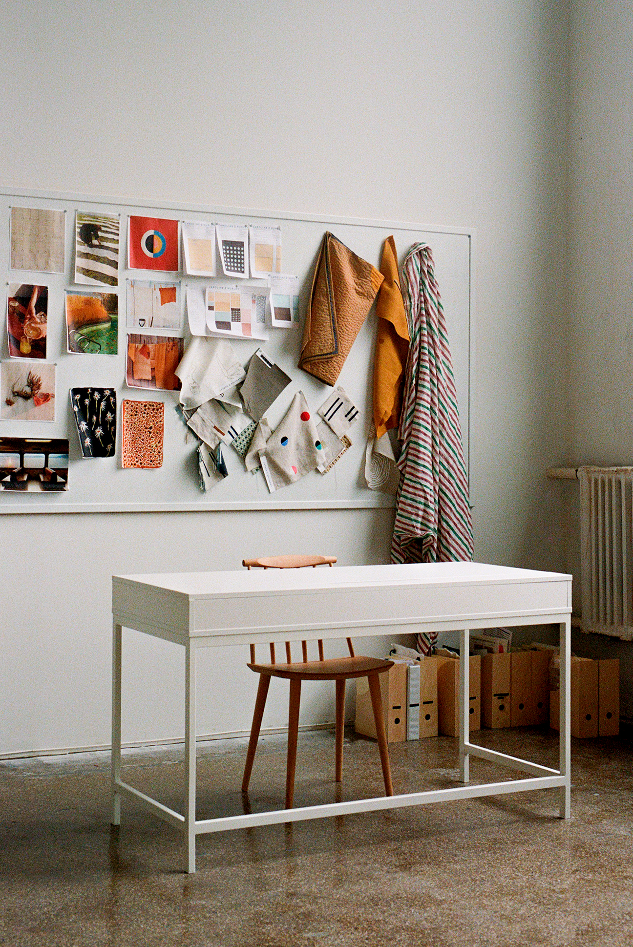 To really concentrate on a project, Hurley heads to her studio in nearby Red Hook. “When I saw the building, it felt right, but the space I ended up taking was in bad shape,” she recalls. After negotiating with the owner, she was able to do away with the black ceilings and bust through a wall that had been covered with cinder blocks to create another window. “I need everything to be white right now,” says Hurley of her work environment. “I’m easily distracted, so it’s vital that my surroundings feel crisp and free of color.” Inside the 3,100-square-foot industrial loft, she dives into her fine arts practice and finds inspiration in her ever-growing stash of fabric scraps, bolts, and rolls she’s been collecting since high school. “Now it’s all housed under one roof and I’m able to spread it out and see everything,” she says. “They all carry their own stories and memories for me.”