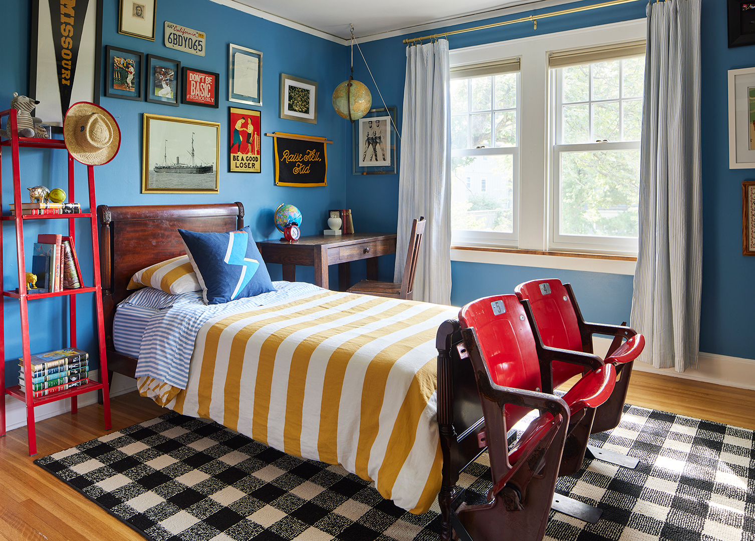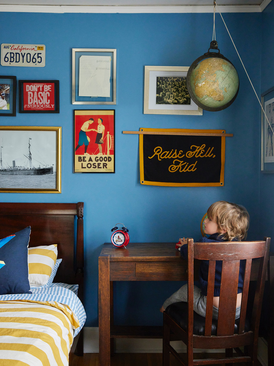 Given this was Rocky’s first post-nursery room, Lidgett set out to design a space that sparked imagination as well as reflection. “His knowing who he is and where he came from is really important,” says Lidgett, noting that the boat photo above the headboard is the exact ship Rocky’s ancestors traveled on when they came to the U.S. from Poland. The portraits of players nearby (Stan Musial and Hank Aaron) were chosen not because of their records, but because they were also just really good people. “My husband was particular about it,” shares Lidgett. “It gives Rocky this map of his own story but also allows us to talk about the man we want him to become.” Ahead, she shares how she nailed the varsity-chic space without striking out.