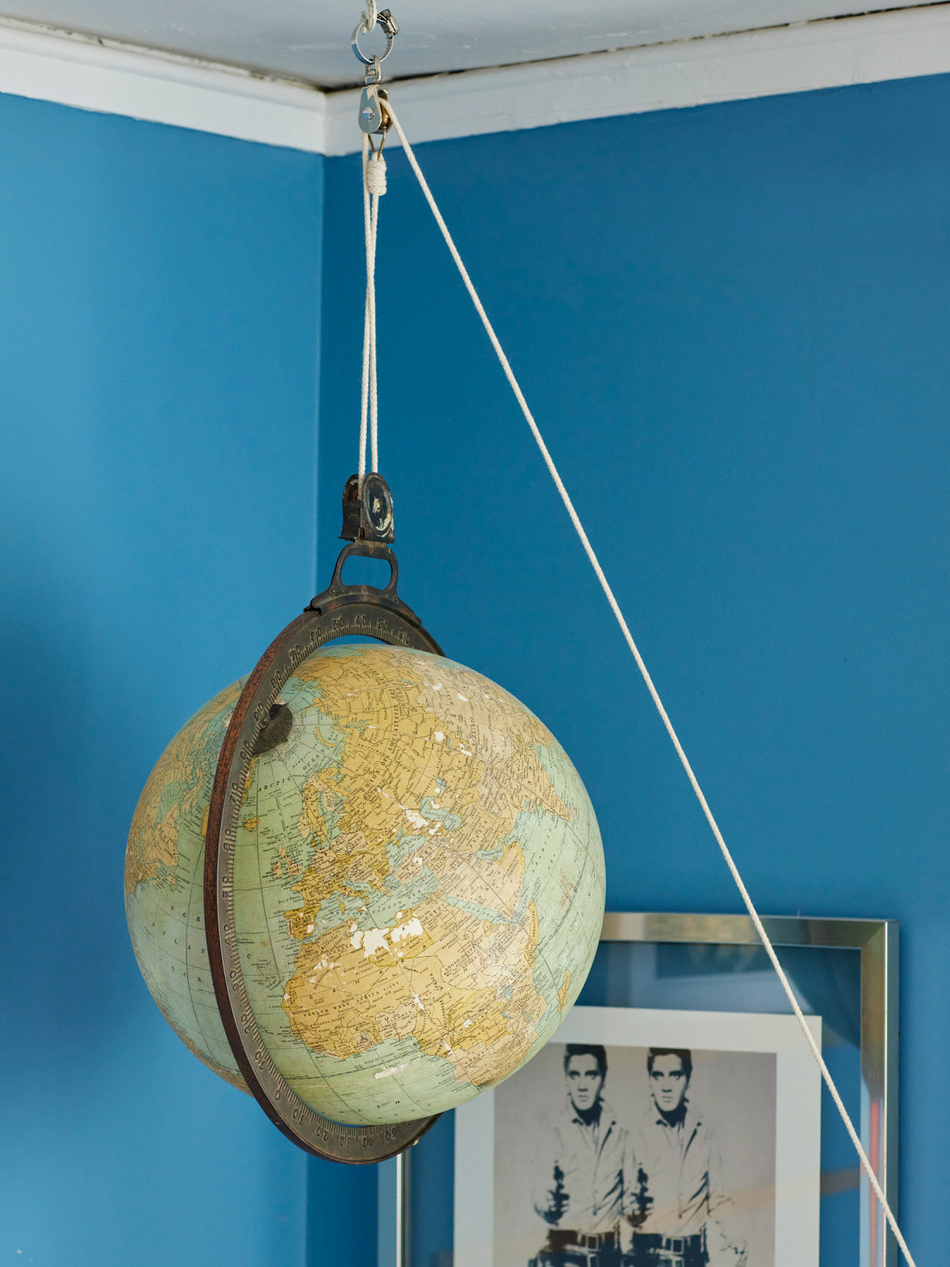But just because Rocky is used to living in a home with lots of art doesn’t mean he’s not tempted to take it off the wall. “There are so many things above his bed, so I make sure they’re as double secure as I would anywhere else. I don’t want something falling on his head,” says Lidgett. The one thing Rocky can freely fuss with is the Facebook Marketplace–sourced globe dangling in the corner (it used to hang in a one-room schoolhouse in the 1920s). The piece is rigged on a rope so that it can be lowered down and studied, making this space a home run all around.