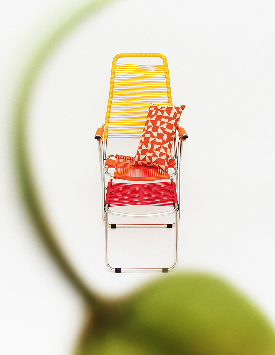 The linear PVC bands on this foldable lounger (the footrest tucks underneath) feel right at home with an equally fiery geometric textile. Now sit back and relax.