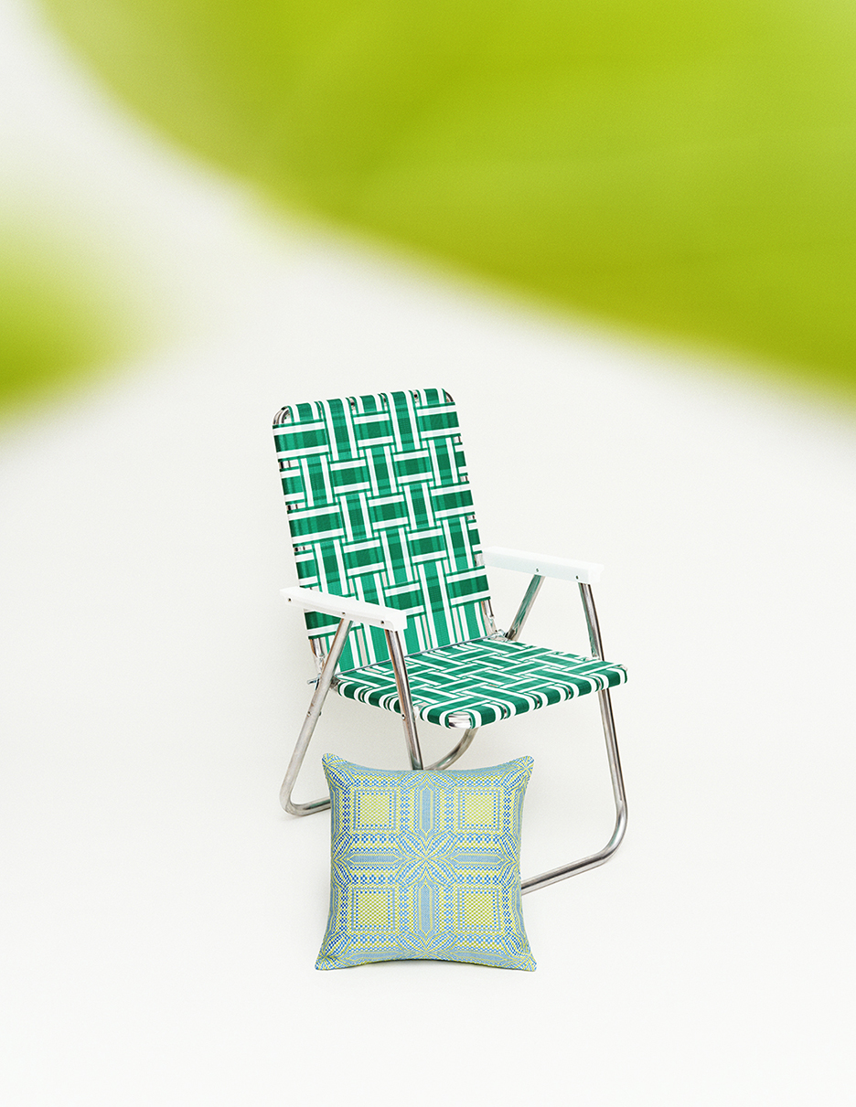 Elevate a Fourth of July barbecue staple with a corresponding cushion, covered in an abstract spin on the seat’s classic woven straps. Just like Jell-O salad, it’s an unexpected pairing that works.
