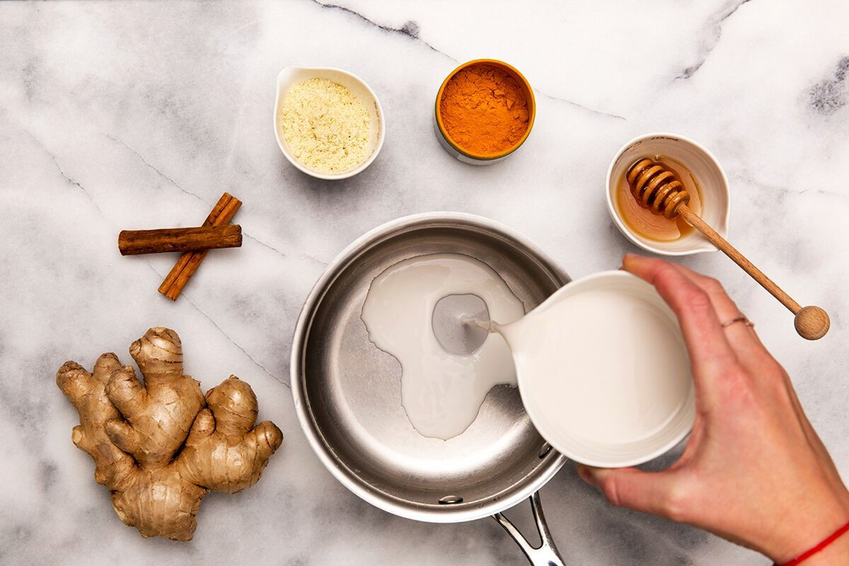-1 cup unsweetened non-dairy milk, preferably homemade coconut milk or nut milk, like cashew or almond (or a mix of the two if you want to get fancy) – 1 cinnamon stick – 1 (1-inch) piece of turmeric, unpeeled, thinly sliced, or 1/2 teaspoon dried turmeric – 1 (1/2-inch) piece of ginger, unpeeled, thinly sliced, or 1/4 teaspoon dried powdered ginger – 1 tablespoon honey or more to taste (Personally, I like it quite sweet so I use about 2 tablespoons.) – 1 tablespoon virgin coconut oil – 1/4 teaspoon whole black peppercorns – Ground cinnamon (for serving)