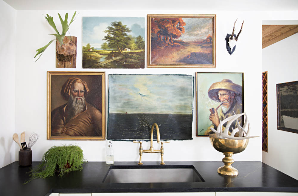 The designer displays a grouping of her favorite oil paintings, scored at flea markets and garage sales, above the kitchen sink.