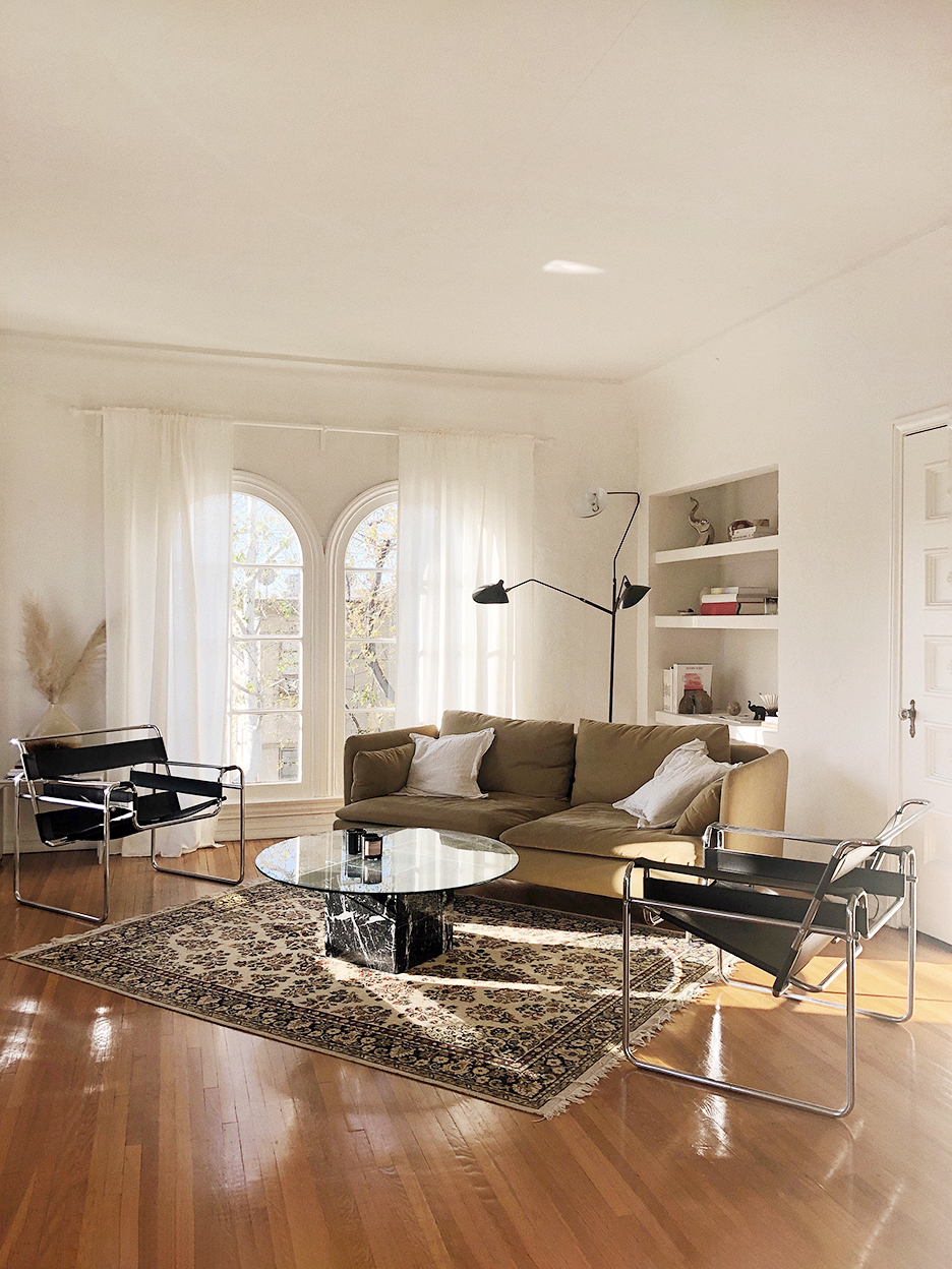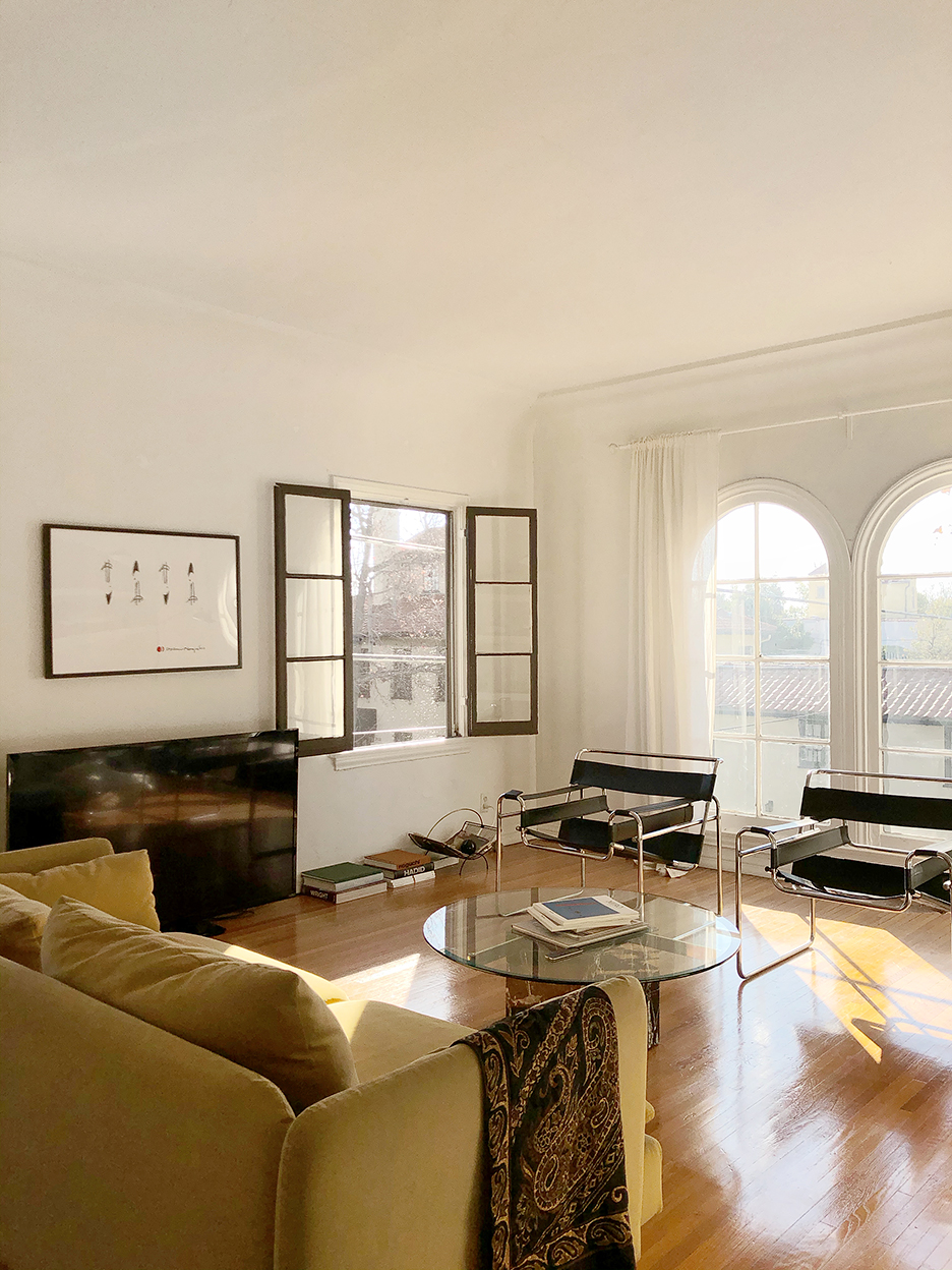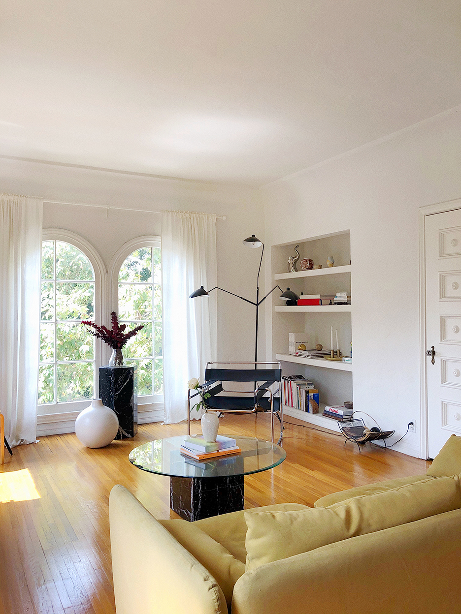 Isabelle Dimang is no stranger to change. After leaving New York in pursuit of warmer weather and continuing a career in fashion (she’s currently a photo director for Nordstrom) seven years ago, the Arizona native settled in Los Angeles’s Hancock Park neighborhood. Her 1920s, Art Deco–style apartment boasts enough character to last several lifetimes (think: a turquoise tiled bathroom, arched windows, and original crown molding), but her living room layout is constantly evolving. Dimang moves things around every few months for a fresh dose of inspiration.