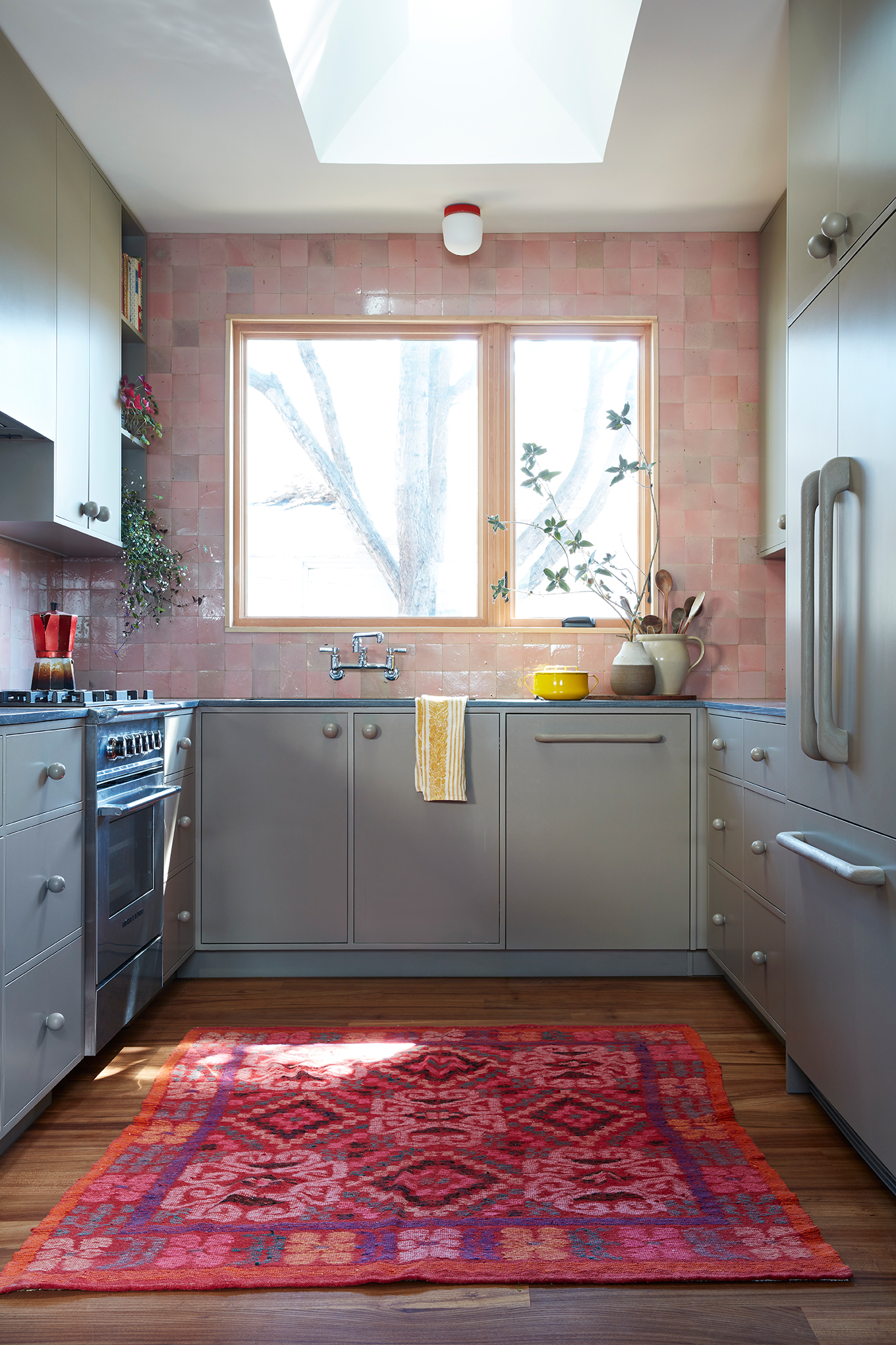 Throughout the process, creative friends and handy folks were pulled in—“including us,” Joanne adds. Wherever wood was meant to be wood, there was Luke. He installed the floors, built the staircase, and paneled the playroom walls, all with salvaged elm from another comrade, Evan Shively, founder of Arborica. For the kitchen cabinet fronts, he used FSC-certified plywood, while the doors and window frames are deodar cedar (which gives the whole home a heady, woodsy scent), a nod to his childhood. “Growing up, we had a bunch of those trees in our yard, and my dad would always take the saplings and plant them anywhere that people would let him,” Luke remembers. “He was like the Johnny Appleseed of Cedrus deodara.”