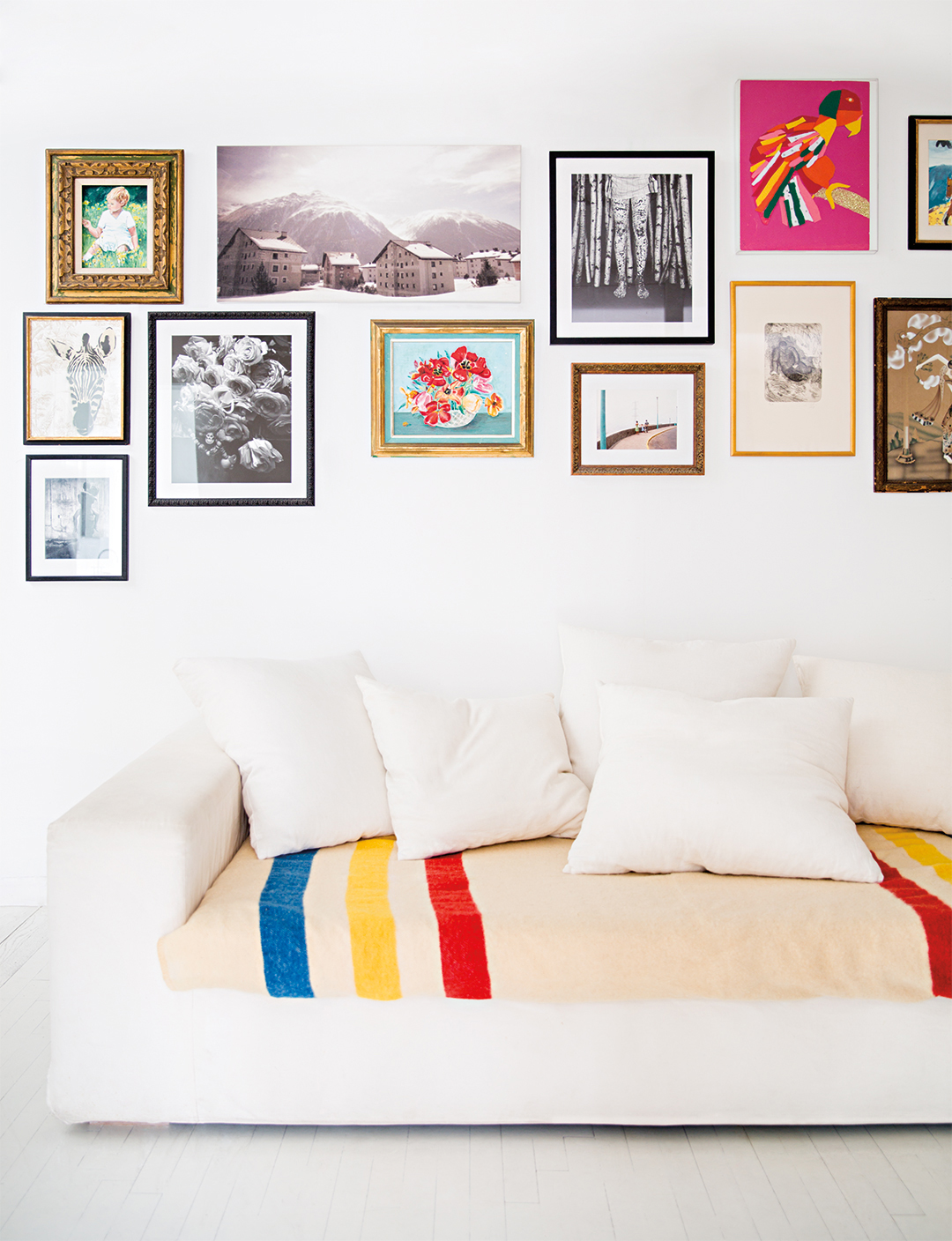 In the case of a classic pattern like stripes, scale is everything. Flea Market Fab founder Jennifer Harrison sewed two blankets with different takes on stripes together: a chunkier blocklike print and one made up of thin lines. The variety lends some soul to the neutral arrangement.