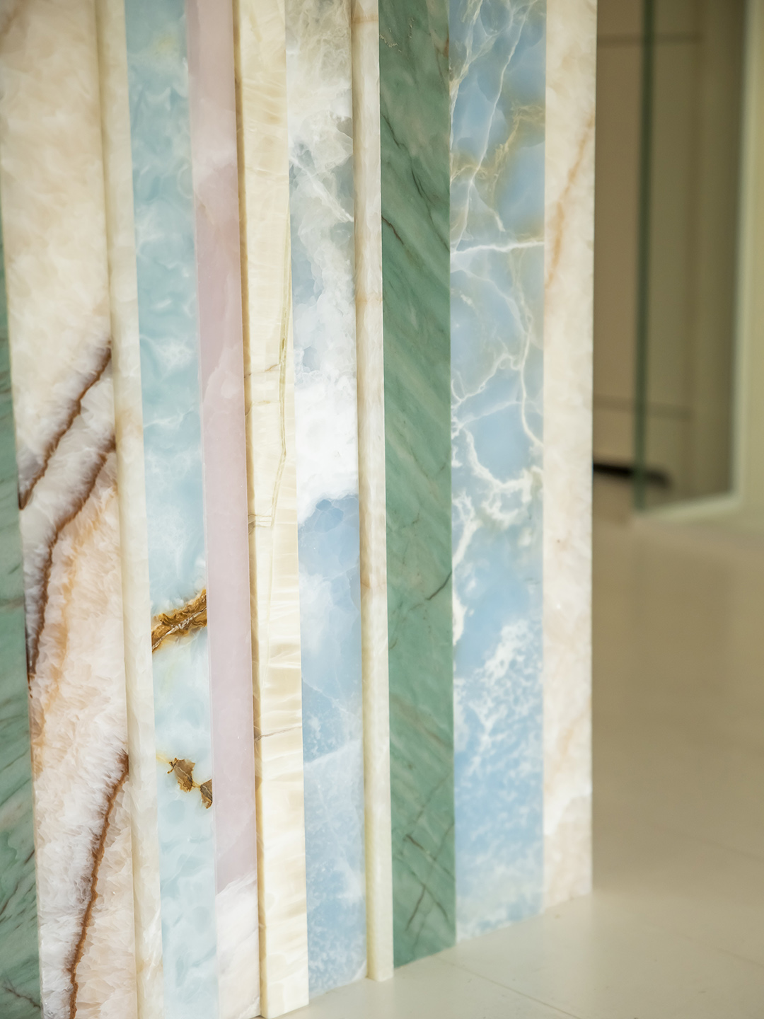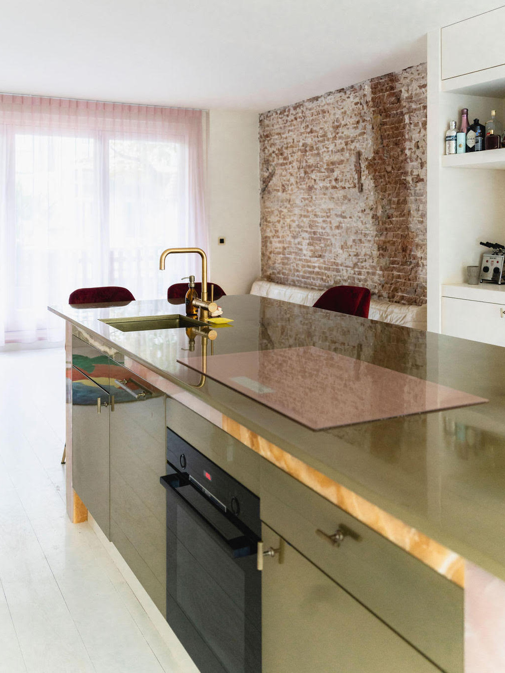 “There was one thing I did not want in my kitchen, and that was marble. I saw that too much and wanted something different,” says Neseker. One day while at a coffee shop, she spotted a countertop clad in different colored strips of onyx. “I knew this was perfect for my kitchen island,” she says. There was no doubt as to where she would find the natural stone: Solid Nature, a Dutch company that’s been around since 2011 and specializes in sourcing unique, colorful stones (its immersive installation during Milan Design Week this year won the award for most unforgettable exhibit).
