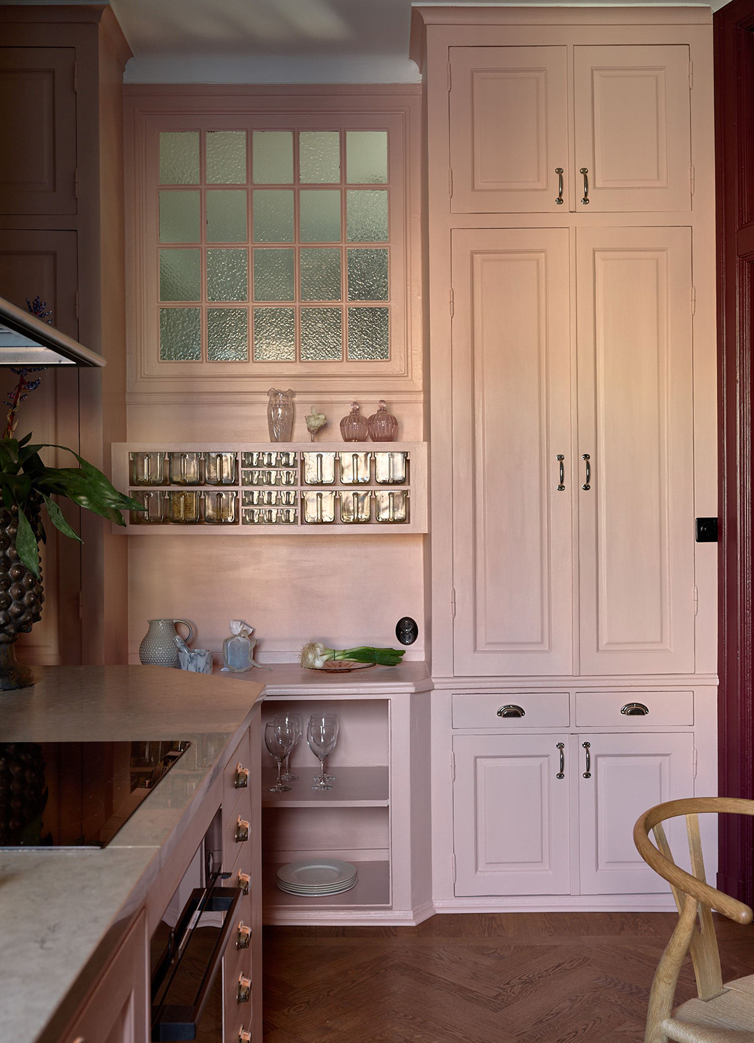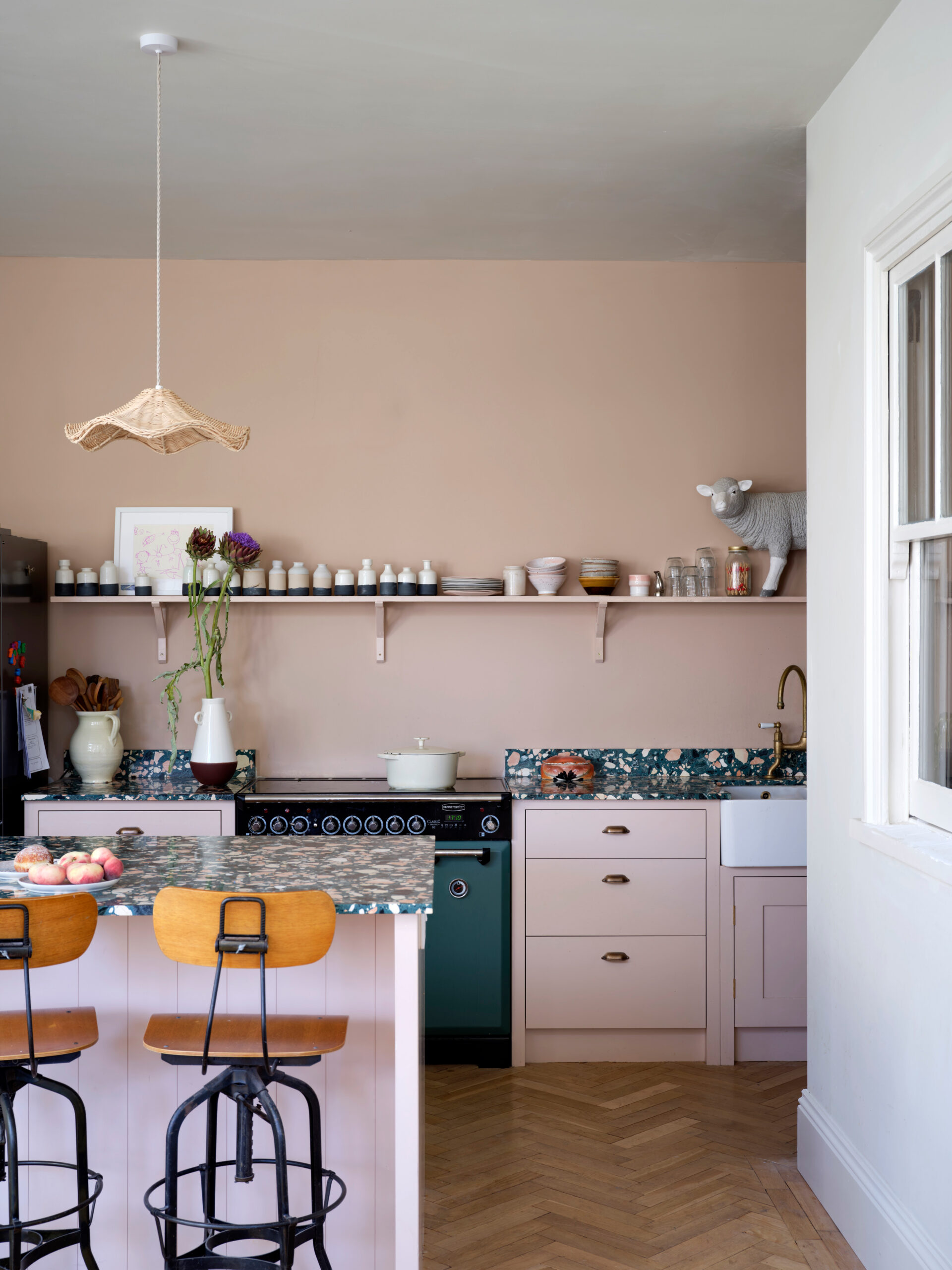U.K.-based designer Sarah Brown tasked Plain English Kitchen with her space’s design, which involved mounting an open shelf above the range where she can display her golden-hued confit pots. Between the miniature paintings, countertop lighting, and dainty row of mugs (also blush!), this well-loved kitchen turns the trend into a classic.