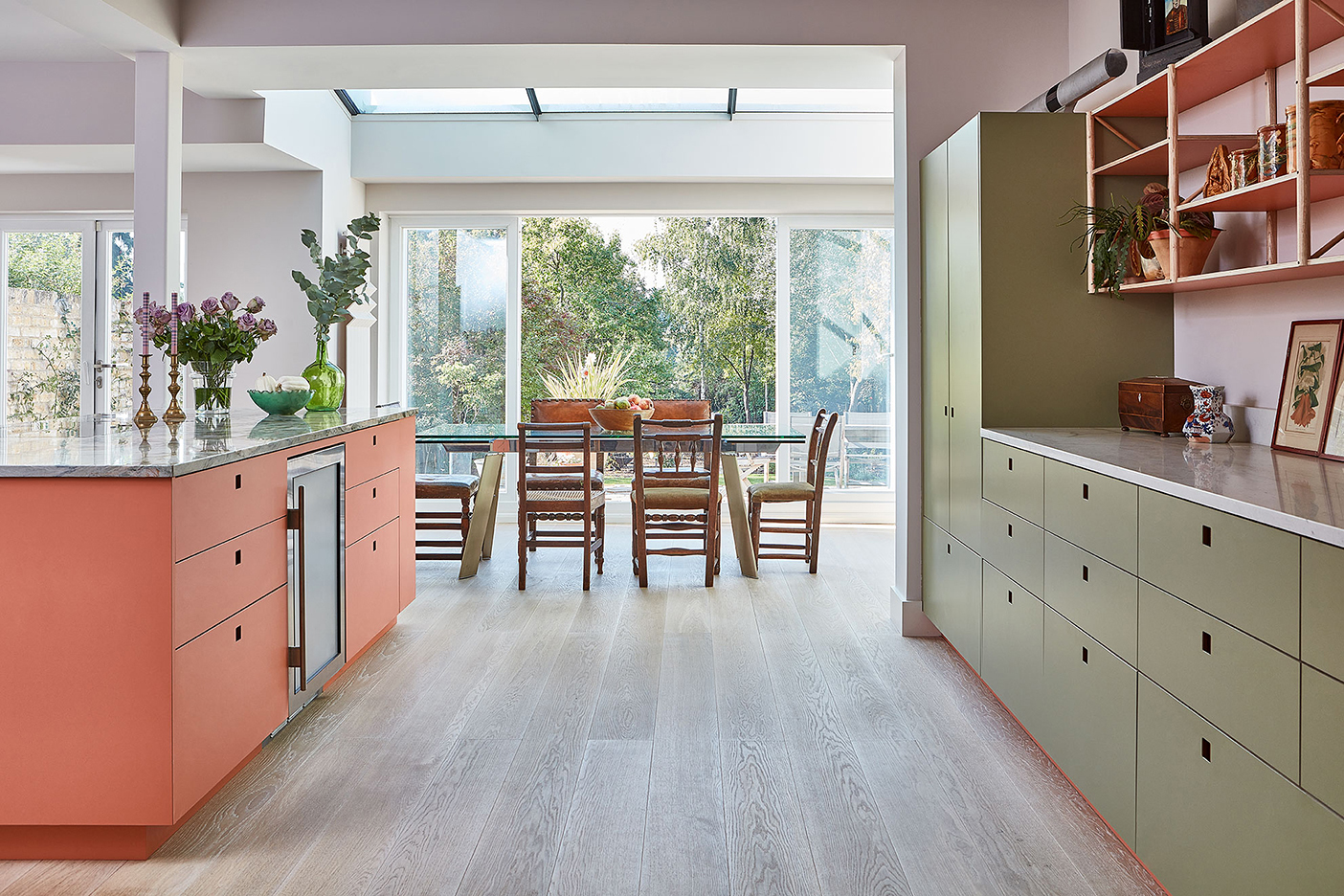 Sage-obsessed folks, this one is for you. The London space balances timelessness and living in the moment with a mix of green wall cabinets and a playful salmon-tinged island.