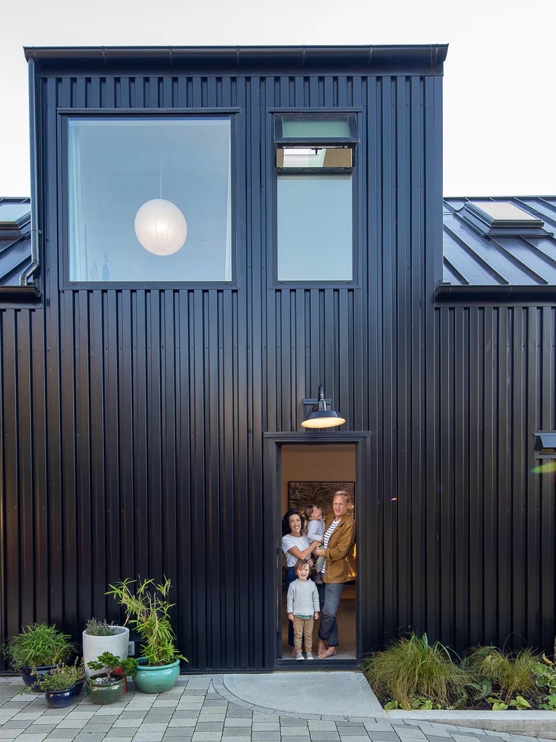 Sara and Adam Gilmer’s family home in Victoria, British Columbia, was an exercise in compromise, but they both had a clear design vision: Sara has a background in architecture, and Adam is the cofounder of a furniture company. Deciding to clad the exterior in raven-hued powder-coated steel was part of their overall collaborative effort. Another plus: It just so happens to coordinate with the rest of the minimalist interior and ensures there are no costly paint jobs down the road.