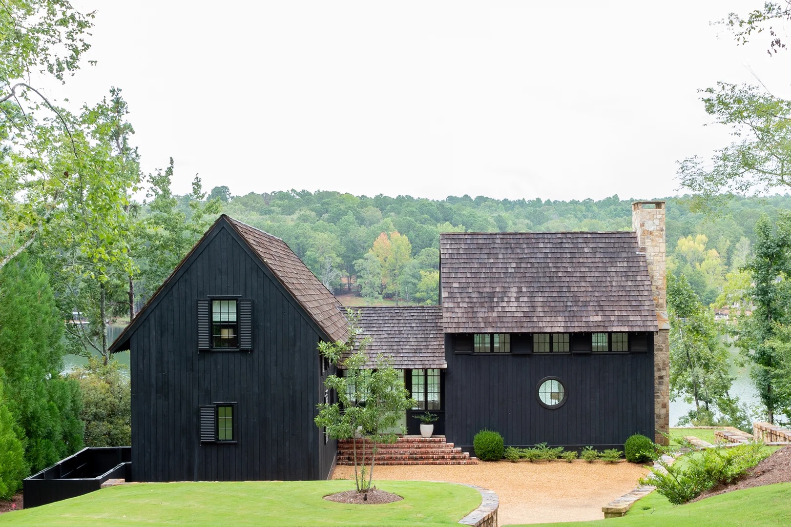 As much as “modern farmhouse” has trended these past few years, the style continues to have staying power—especially if a dramatic paint color keeps things unexpected. Alabama-based architect Paul Bates took up the challenge on this lakeside property, which features a traditional saltbox frame but feels of-the-moment thanks to the allover black shade.