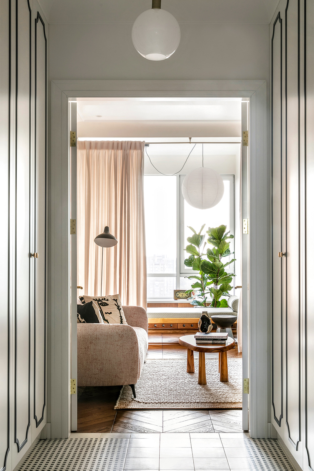 Another drastic change was the overhaul of the layout. Molodykh turned it into an enfilade, where rooms flow into one another via perfectly aligned entryways. The en suite bathroom is accessed via a dressing room that connects to the bedroom, which is located directly off the living room. Given the feature’s tie to grand European architecture, naturally it appealed to Obez. “It’s very rare in modern buildings and has a wow effect on guests visiting for the first time,” says the homeowner.