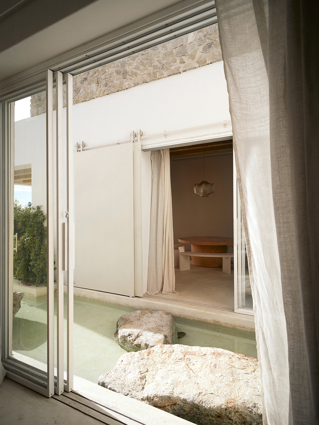 Unlike Ponis, Scalesciani-Hawken didn’t find any cool rock formations in El Pescadero, but she did discover something else: boulders hidden beneath the earth that she excavated and placed in various parts of the residence. Some are used as stepping stones inside the pool, others as stools to lounge on. There are even a few that serve as platforms for fireplaces and embellishments for walls. As she explains, finding each one a home took some thinking—and a mighty team of 10. “I needed to intuitively listen to each rock and learn where it wanted to live. Sometimes the final look of the room surprised me and was guided more by the stone telling me where it wanted to land rather than me making it fit into my vision,” reflects the designer.