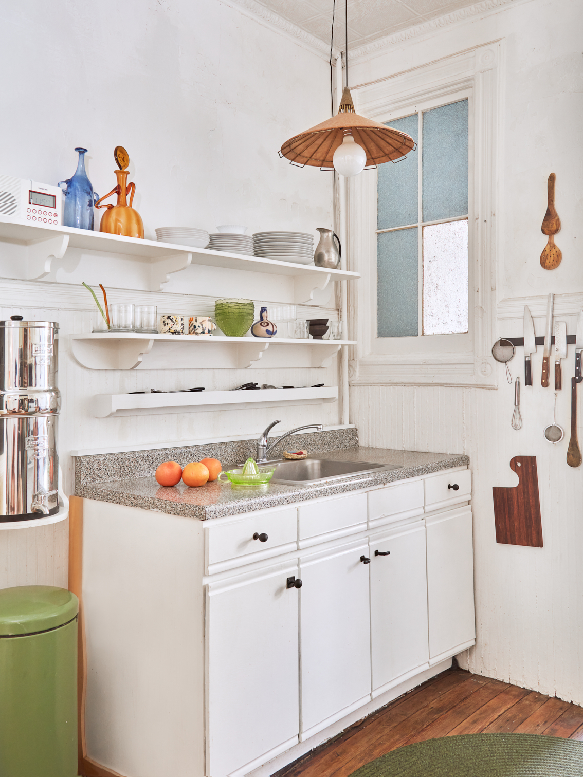 Thrilled as Burns was with her discovery, she also found the surface underneath had been painted burgundy (not to mention covered in glue residue), plus the kitchen cabinet situation was nothing less than claustrophobic and there were smoke stains yellowing the walls. “It needed a lot of TLC, but I wanted a challenge,” she says. Now the only yellow in sight is on the cheerful curtains covering the front door and cupboards framing the fridge.