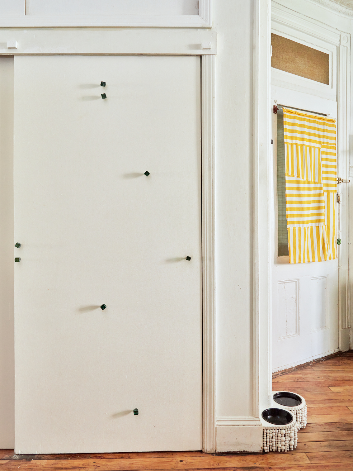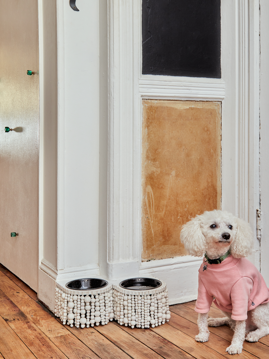 Even Frank, Burns’s bichon frise–poodle mix, has a bespoke moment in the apartment: His food and water bowls are built into the wall so that they float off the ground. “It’s better for his digestion,” the designer says. “And I just love him so much I decided to bead them.” Milk-painted wood balls hang from twine around enameled bowls. They were such a hit, the detail also makes an appearance on sconce covers in Old Jewelry Store, her newly opened shop in Chinatown.