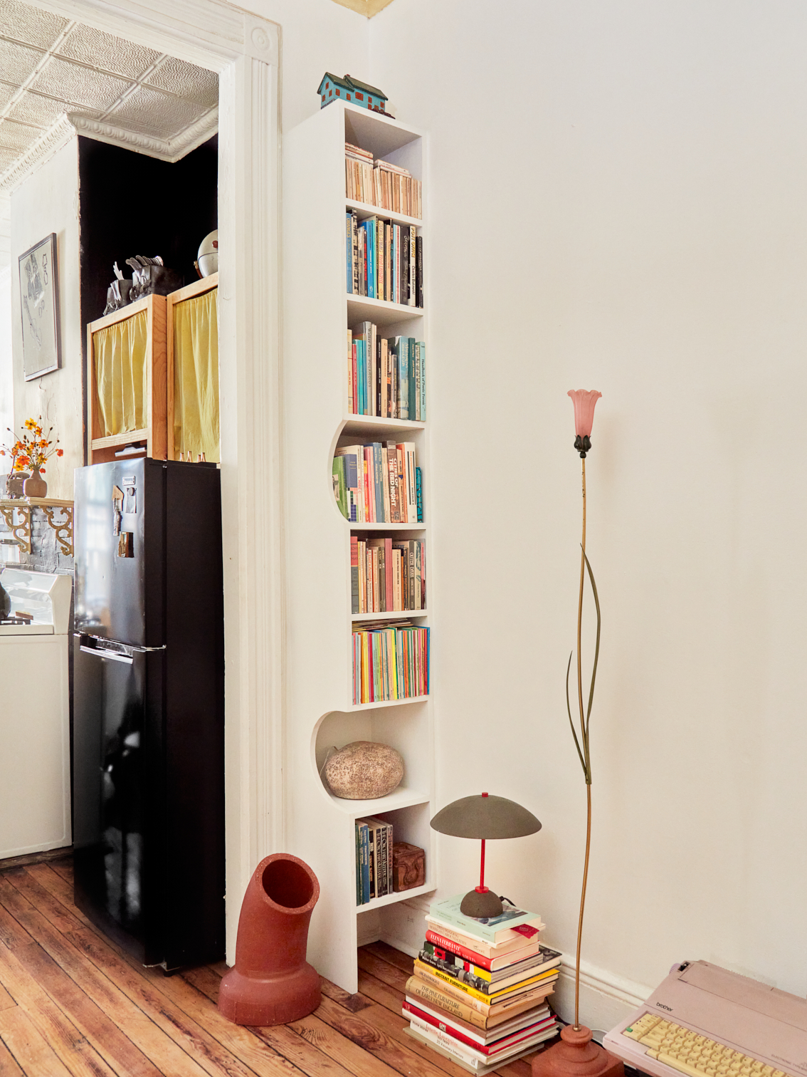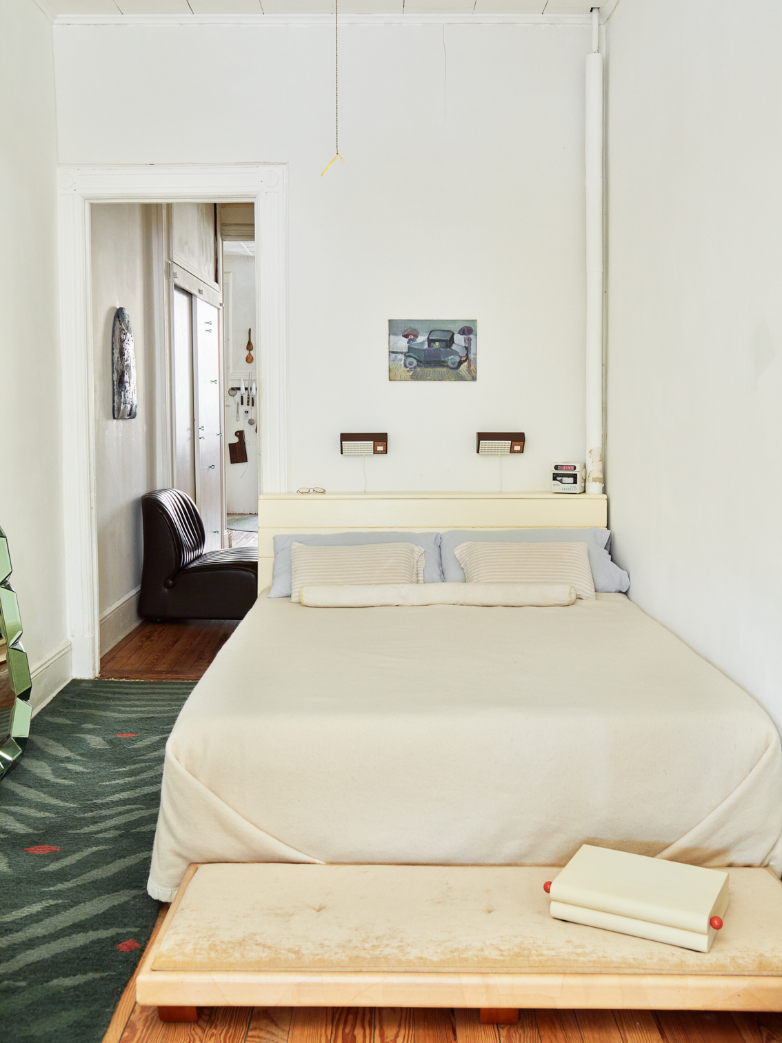 Patience was key for her next act. Luckily, her master’s degree in interior design from the New School primed her for a more steady pace. “My thesis was an argument for a slower interiors practice,” she recalls. Rather than decorating everything at once, her intention was to live with things and play with the placement of one or two pieces at a time. “My bed was on the floor for a year and a half! It wasn’t that I was noncommittal; I just needed time to figure out what I wanted.” Unlike most railroad layouts, where people might put the sleeping quarters at the far end, she let her office take that spot. To this day, she continues to change and rearrange the space; it’s never really “done.”