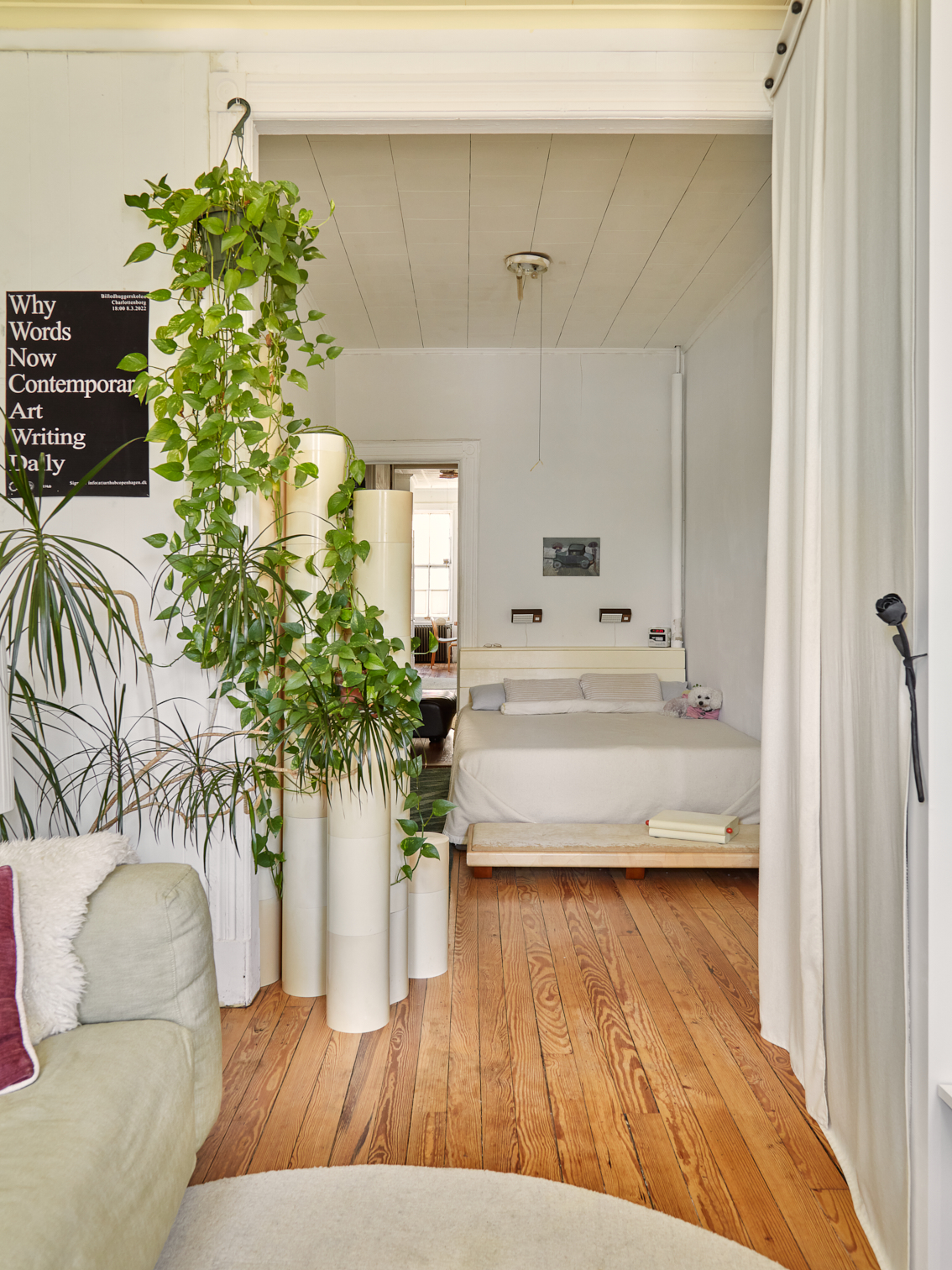 Even something as small as a knob takes on new meaning. A collection of vintage green glass ones from a flea market dot a closet panel after not having a home for years. “One day I followed a whim and sort of bedazzled the door,” she shares. “You could grab the door nearly anywhere and slide it open.” One of her favorite details is the blackened steel protrusions that frame the top of her closet. She designed the storage with the idea that she could leave the plywood box behind and bring the rails with her to a future location. It’s a new concept she’s been exploring, and she imagines a space where an entire wall could be punctuated with those metal pieces, making it possible to easily transition a room season to season simply by switching out fabric panels.