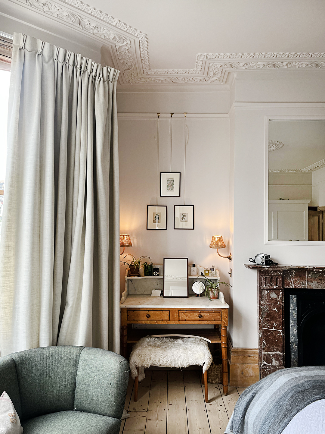 You’d never know looking at Leanne Kilroy’s bedroom and bath now, but at one point during her remodel, there were gaps in the shower floor tile, a permanent marker stain on the dresser’s marble countertop, and an irremediable leak coming from the tub spout. That’s the thing about renovating: Sometimes you have to go through all the painful mistakes to get to the right place. “It was actually a blessing in disguise when the original penny tiles I had purchased for the shower were laid incorrectly and had to be ripped out,” says Kilroy, the interior designer and founder of London-based firm Good Bones. Having the opportunity to see them in the space, wonky-looking and all, inspired her to switch gears altogether and purchase the green tumbled marble tile she’d secretly wanted all along. “And I really, truly love it,” she adds.