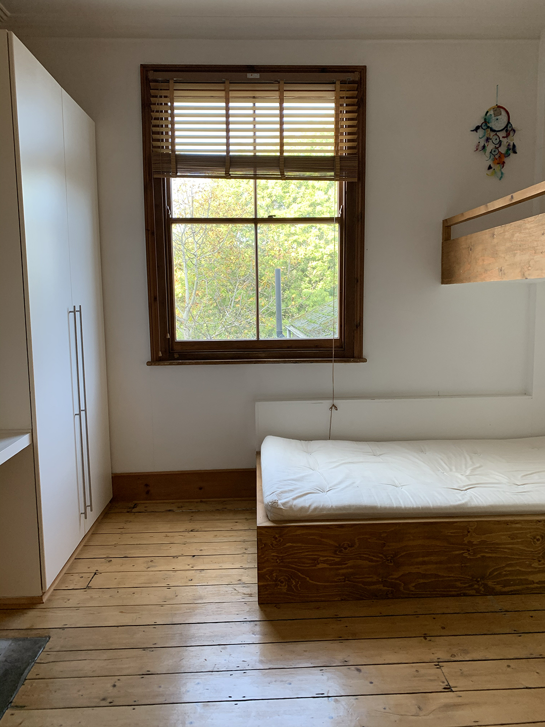 Both the bedroom and bathroom layouts were designed to have circular circulation. In other words, you can walk all the way around the tub and, likewise, you can do laps around the freestanding wardrobe that doubles as a headboard. Not only does Kilroy find that dead ends often lead to gloomy corners, but the openness makes her life as a mom of three easier. “I’m always lugging around armfuls of things that need tidying or cleaning, and I’m constantly forgetting things here and there. Having shortcuts is a small but constant joy,” she says. The same goes for the primary suite’s relationship to the rest of the house: The bedroom and bathroom are connected to each other, of course, but each one also features a separate entrance to the stair landing.