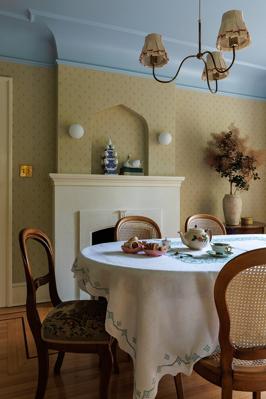 A young couple, who now have two children, purchased a 1920s house that looked straight out of a storybook, inside and out. The interior was a pastel time capsule adorned with delicate lace, intricate patterned wallpaper, and ornate trinkets. Right away, Bidgood could tell the home just fit its owners. “The wife’s demeanor is very soft and sweet, and I think it’s so important that the spaces that we design reflect the people we’re designing them for,” she says. Bidgood wanted to maintain the sense of coziness and timelessness while also making the space functional for their growing family.