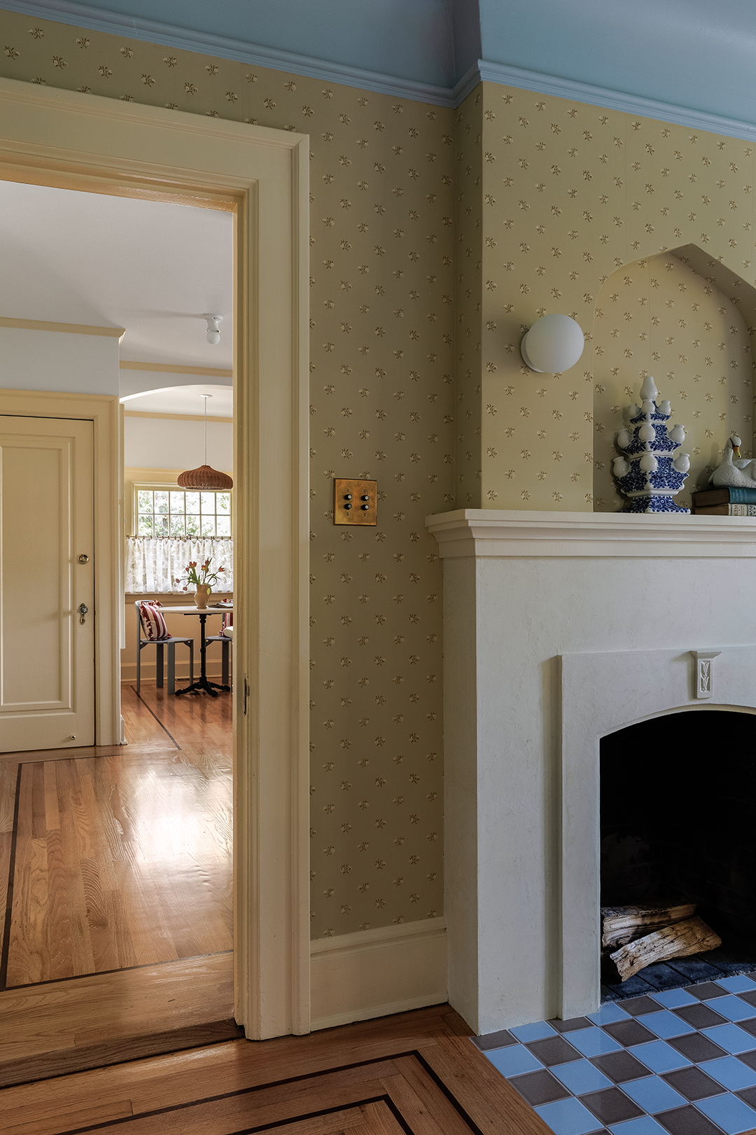 The dining room reno came down to a series of cosmetic tweaks. Bidgood plopped a new gas insert in the fireplace and surrounded it in checkerboard tile, swathed the walls in a floral paper, and installed a chandelier with skirted shades with red stitching. When blending old and new, Bidgood often leans older with the built-in elements (i.e., millwork) and playful with furnishings and lighting. “Because those things are easier to change,” she notes. It also prevents a home from feeling like a history museum. “There’s less creativity when you’re just creating a replica of the era,” she adds. “I like putting a modern take on what’s appropriate for the home.” Grandma would approve.