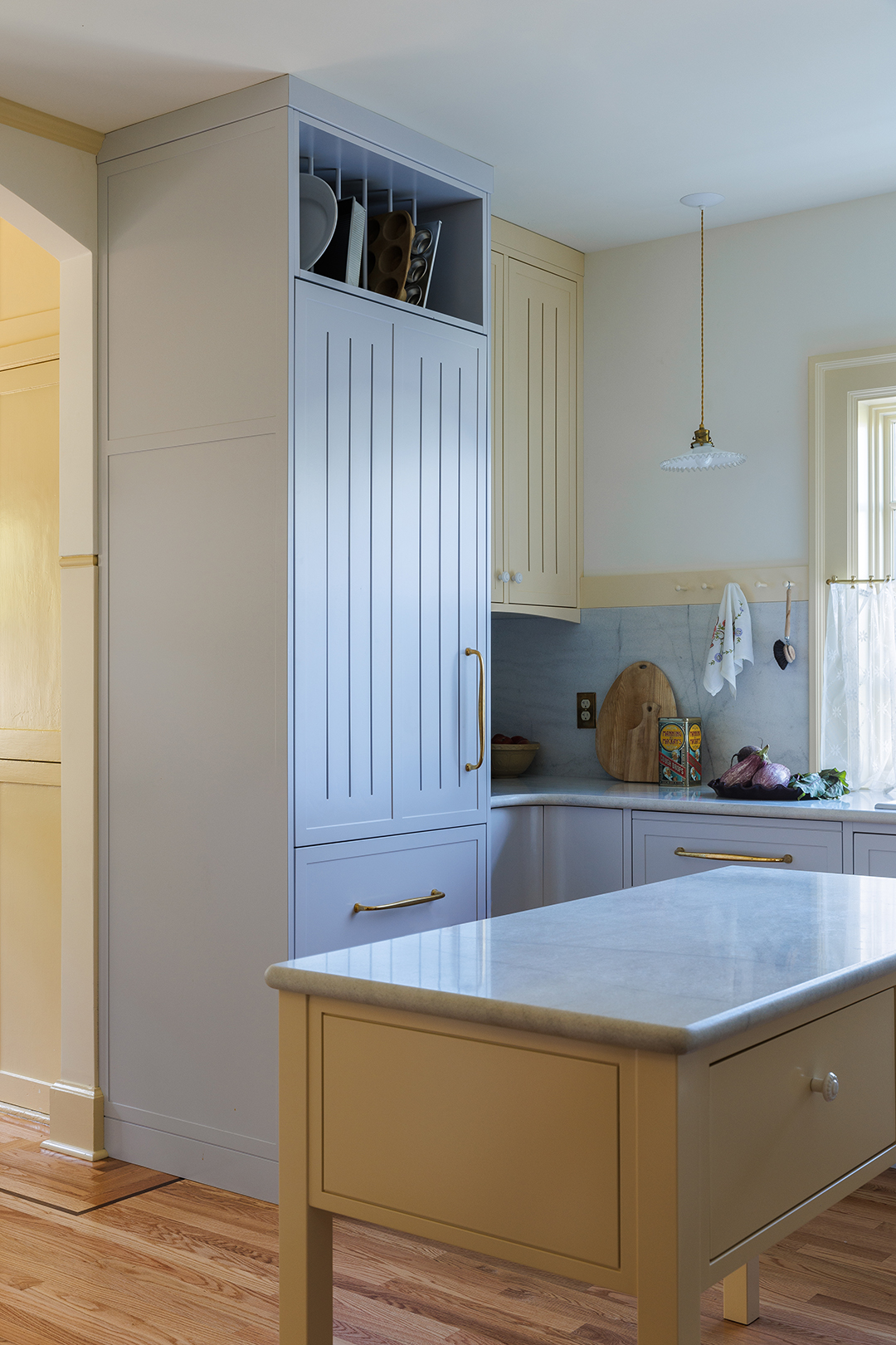 Incorporating curved cabinetry felt like a safe move for a family with young kids (the fewer sharp corners, the better), but also because the millwork is reminiscent of the home’s era. The slatted upper doors are another nod to old-school kitchens, which featured similar openings for airflow. “They have a function to them, but they also add this really beautiful charm,” says Bidgood. To ensure the woodwork lasts 30-plus years, Bidgood opted for sturdy birch-wood boxes. Meanwhile, the pastel periwinkle and butter yellow palette add some much-needed freshness to the space. “You don’t see these soft pastels in a kitchen often, but it’s got a softness to it,” adds the designer.