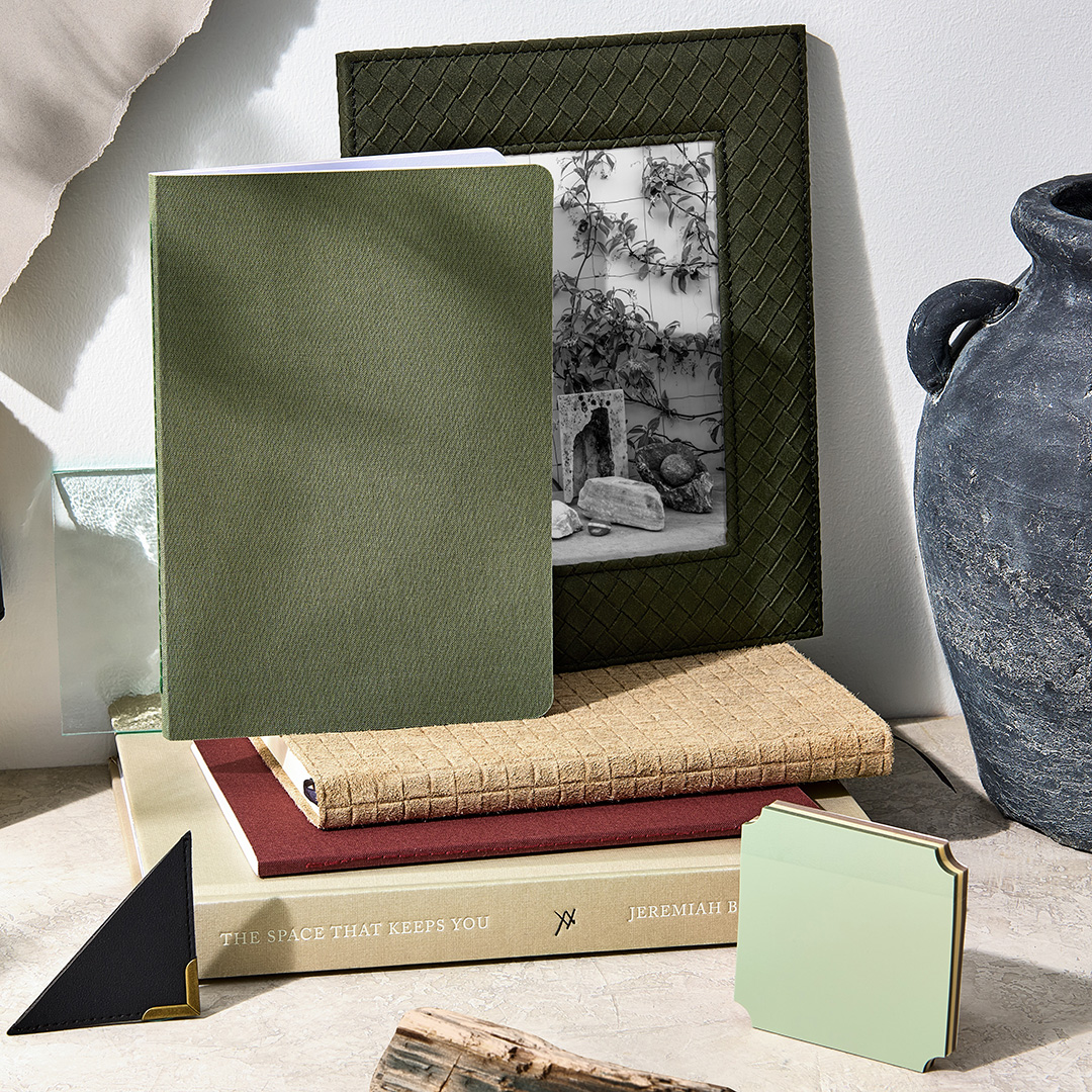 Jeremiah Brent fashions himself a tactile person, a characteristic you can see so clearly in the offices he designs, including his own. Materiality and texture are paramount, like in his leather-swathed desk or the mix of organically-shaped furnishings and marble; even his moodboards have a three-dimensional quality to them. The same can be said for his latest collection with Paper Source, a tight 18-product line that includes items like soft leather corner bookmarks and picture frames, a marble paperweight, and a suede, gridded journal. “This collection is a tribute to the raw beauty of nature’s elements—metals, glass, stone, wood, and leather,” Brent shares. It pairs really well with the designer’s handsome custom stationery, too.