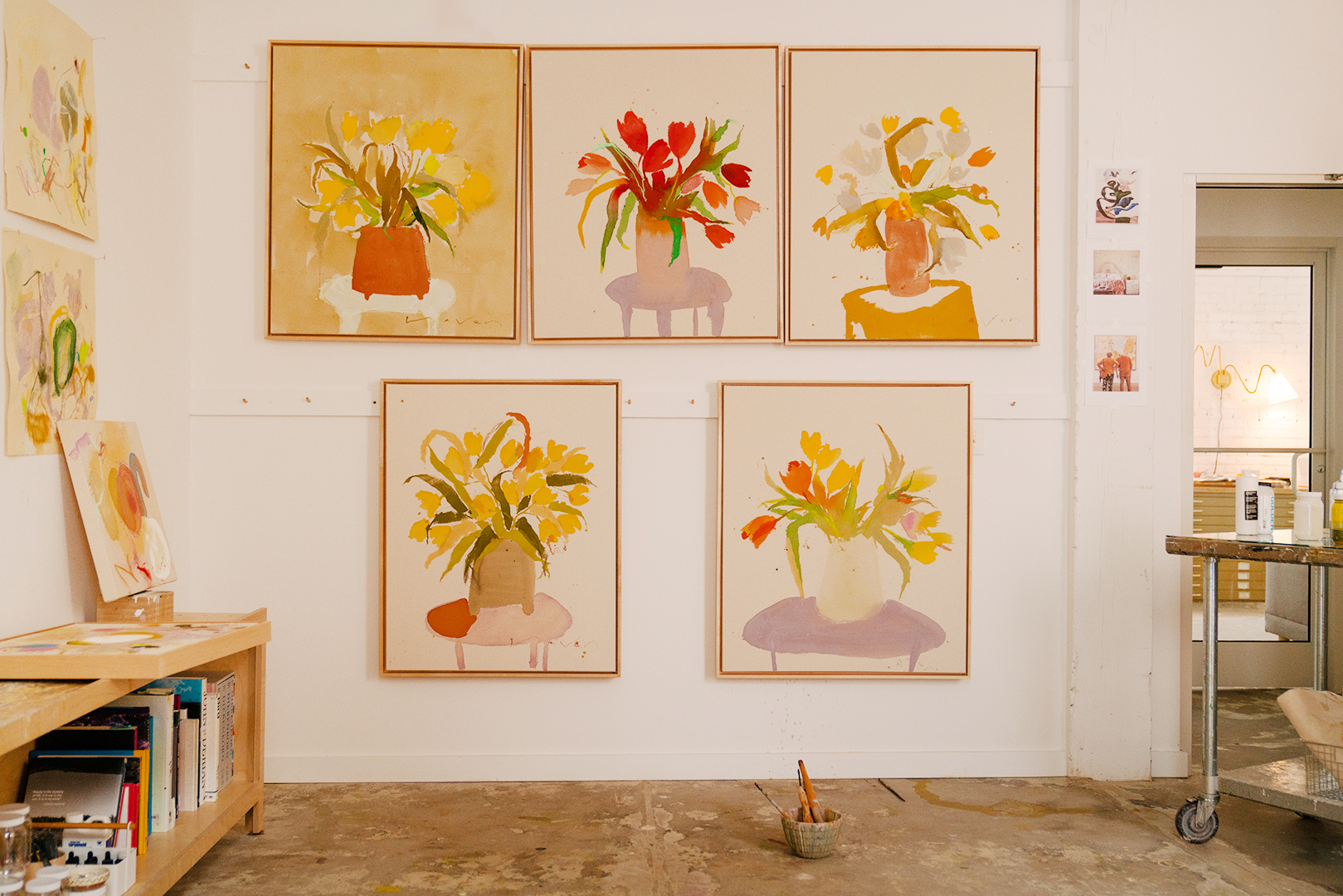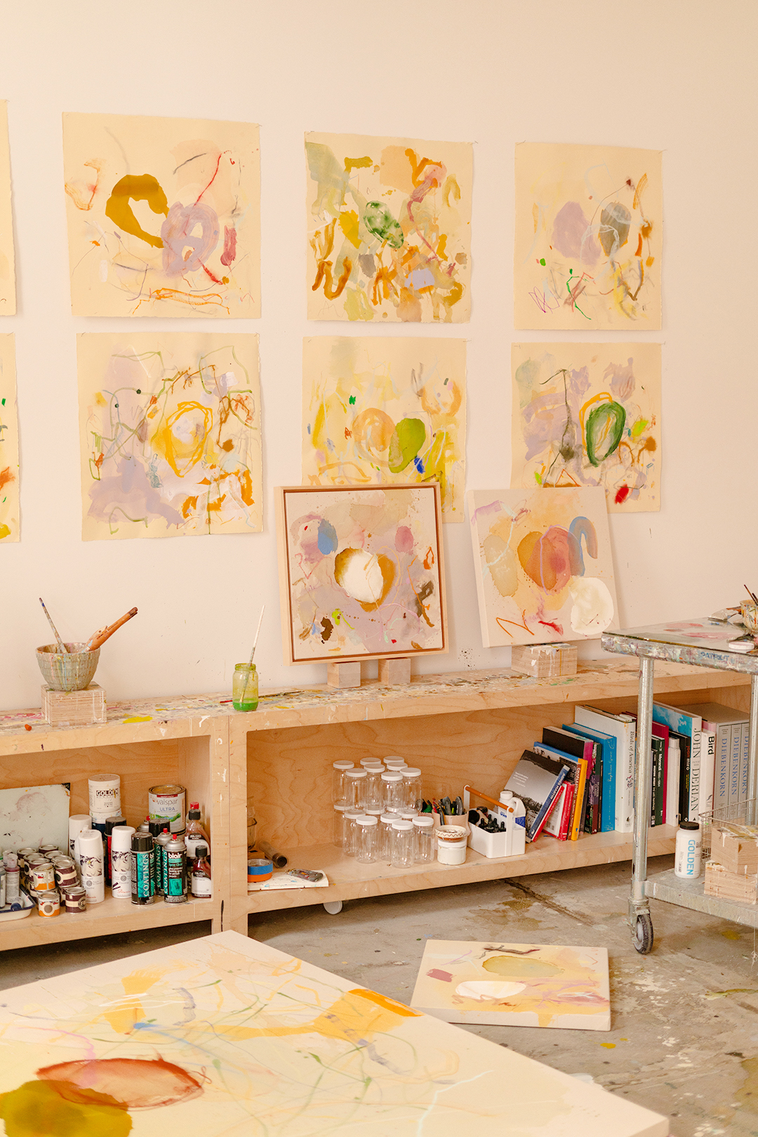 What’s on the walls: Paintings in various stages of completion. I just finished up my next Nest series, which is probably the series I’ve been painting the longest. It’s about the messiness of home.