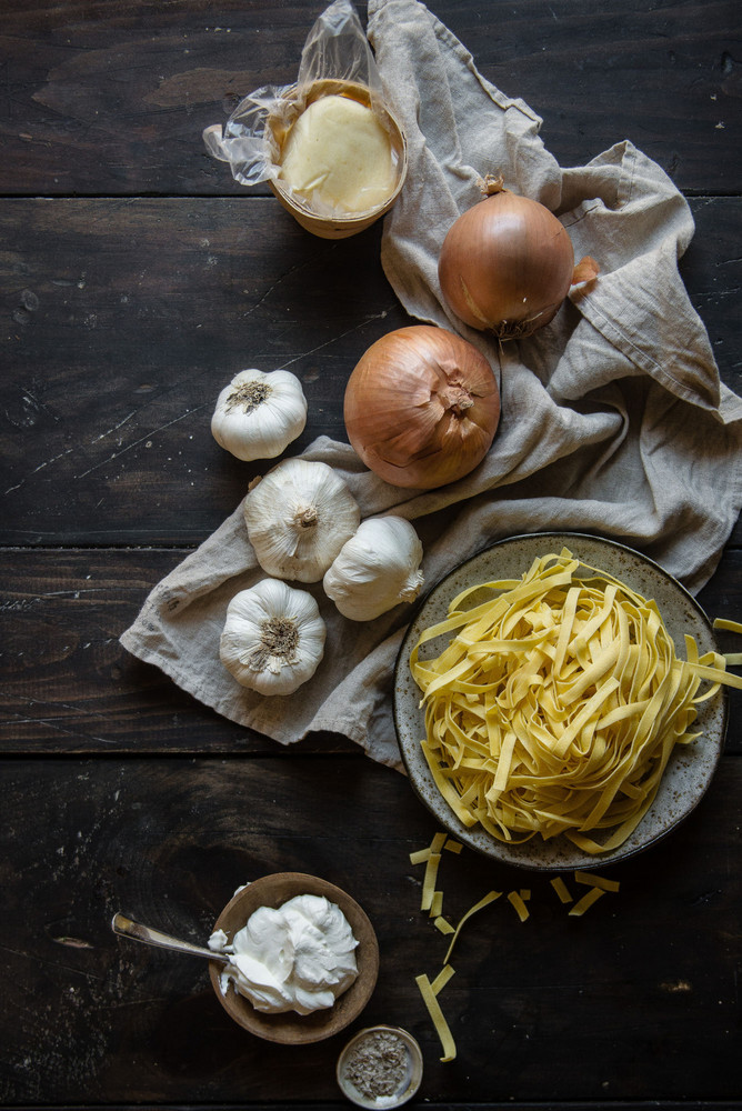 a healthier alfredo: creamy yogurt pasta with caramelized onions & roasted garlic