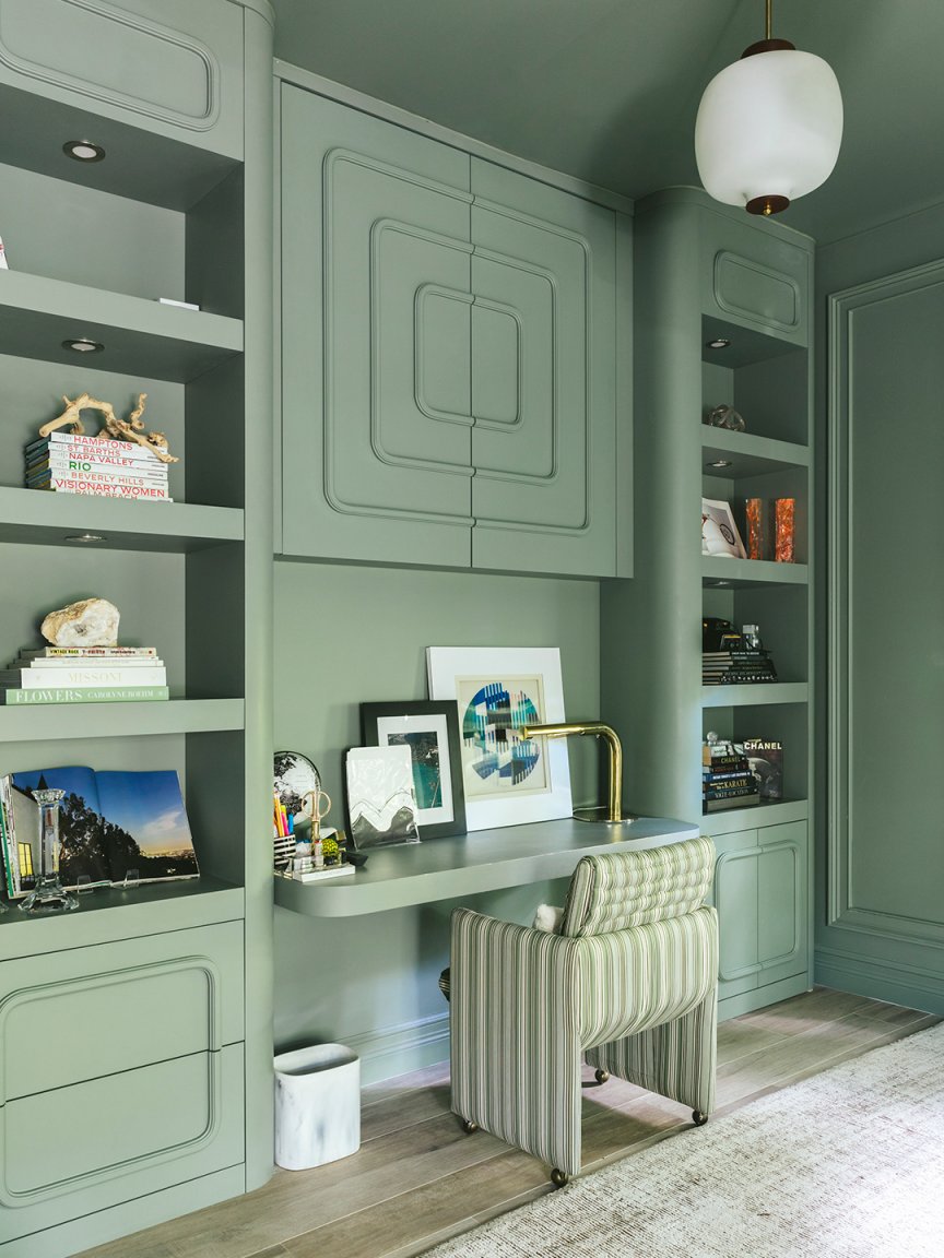 A Curvy Spin on Picture Frame Molding Takes the Formality Out of This Sage Green Office