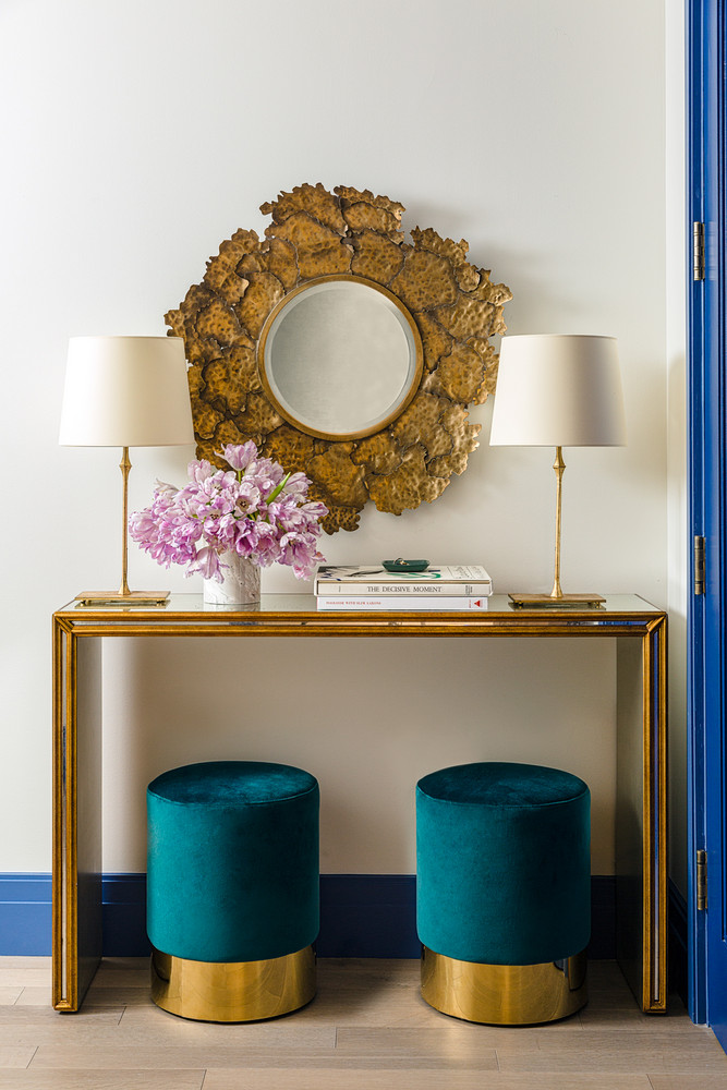 “I took stuff that was in my wheelhouse—colors and patterns I like using—and I drew inspiration from these amazing views,” explains the designer, who felt particularly moved by the dreamy jewel tones found just outside the home’s tall windows, all of which boast treatments by Smith & Noble. “You do see natural elements of the river and a few parks, but there are so many beautiful buildings down here. There’s green glass; there’s this beautiful pink glow at sunset you see across the river and on a lot of these reflective surfaces.”