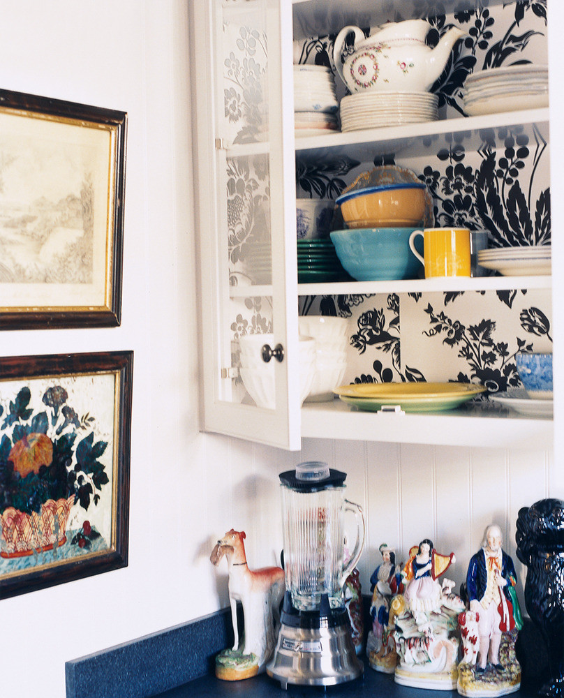When you want to add just a touch of color to cabinets, think inside the box. Line the back of your cabinets with a pretty pop of color or wallpaper to brighten it up.