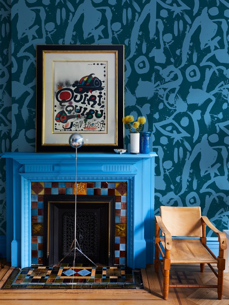 The main living space was made to feel like a sunny vacation, where hand-selected tiles from Spain in the kitchen bring out the brightness from the nearby garden. The pastel shades, especially the rosy pink and bold teal, continue into a playful family room accented by an intricate mantel found in a salvage yard. Even the floral wallpaper used in the dining room and along the staircase are in keeping with the sunny disposition of a getaway, despite its origins in the Liberty of London store.