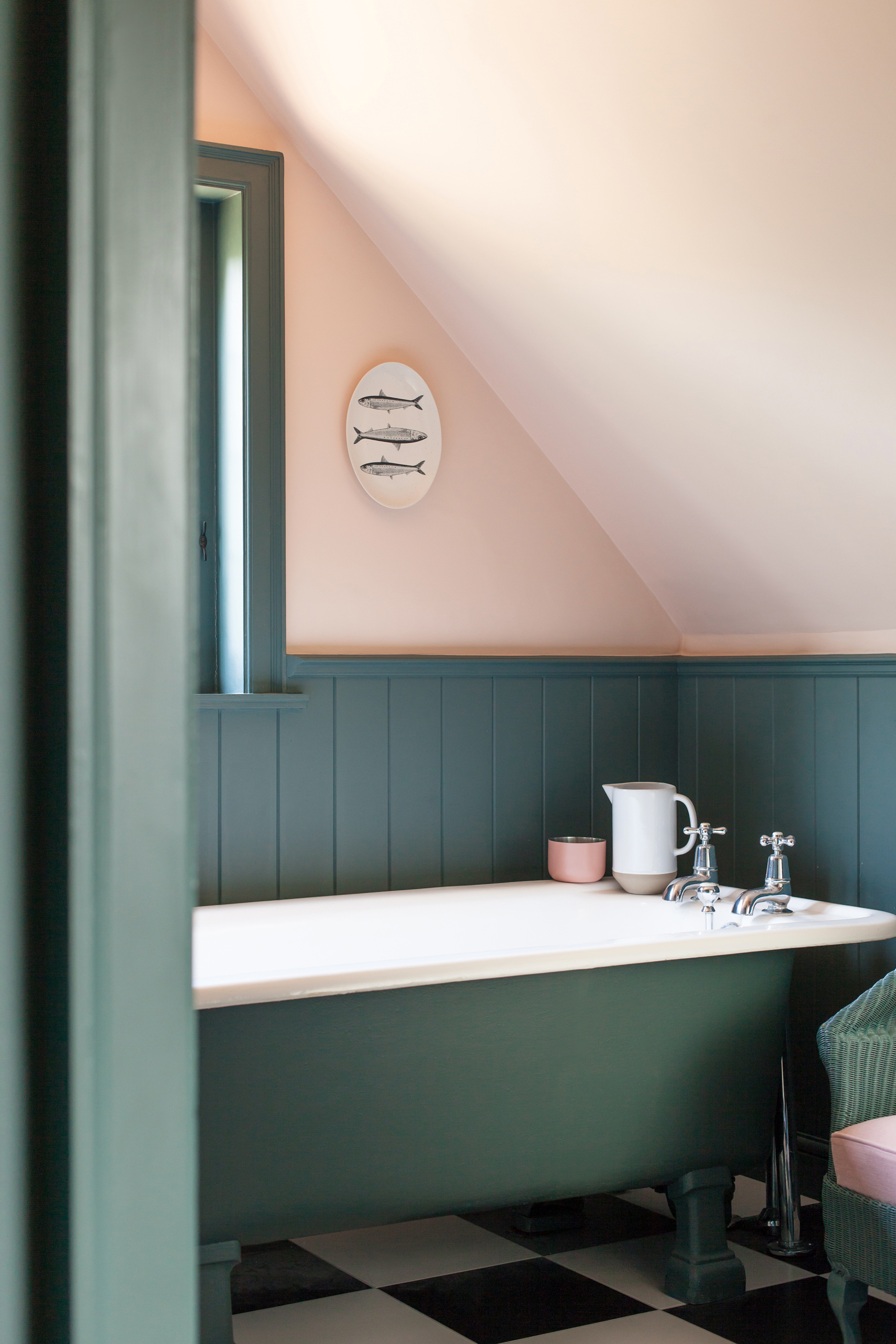 It’s in the attic family room that the pink and green theme truly shines. The entire space is painted in graphic hunter green and blush pink walls by Farrow & Ball. While some period detailing still shines—like the fireclay brick fireplace—the ease of contemporary living and the playfulness of color and pattern gives way to a kid-friendly playspace complete with a kitchenette and bathroom.