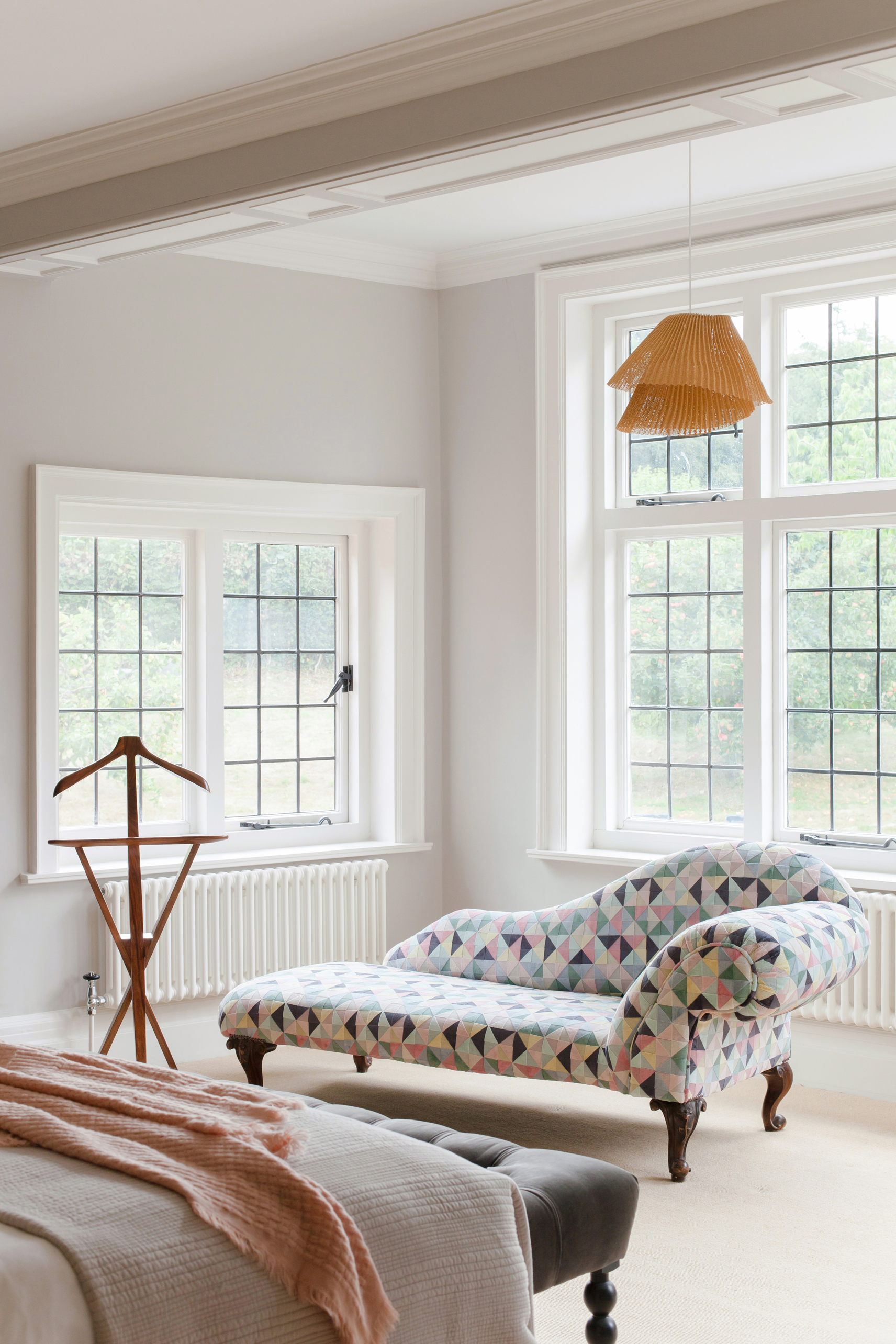 In the master bedroom, a vintage chaise was reupholstered in a colorful graphic fabric by Osborne and Little—a nod to the designers’ philosophy of “decorative joy.” “Our goal is to make living lovely, one room at a time,” explains Whitehead. With each floor, the decor gets a little more colorful and playful.