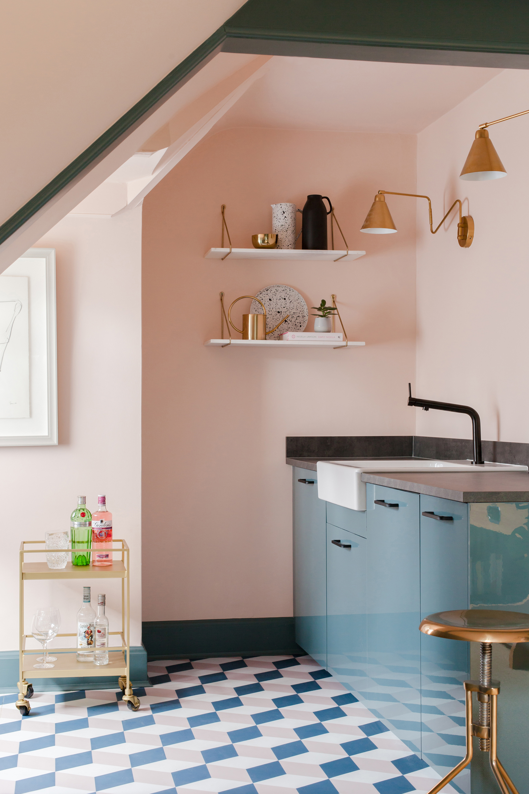 The kitchenette—also in keeping with the color theme—is made up of built-in Ikea cabinets and completed with an Atra vinyl flooring in a pink-and-green cube pattern. Small accessories sourced from H&M Home give the space an elevated yet affordable feel that’s ideal for a third-floor playroom.