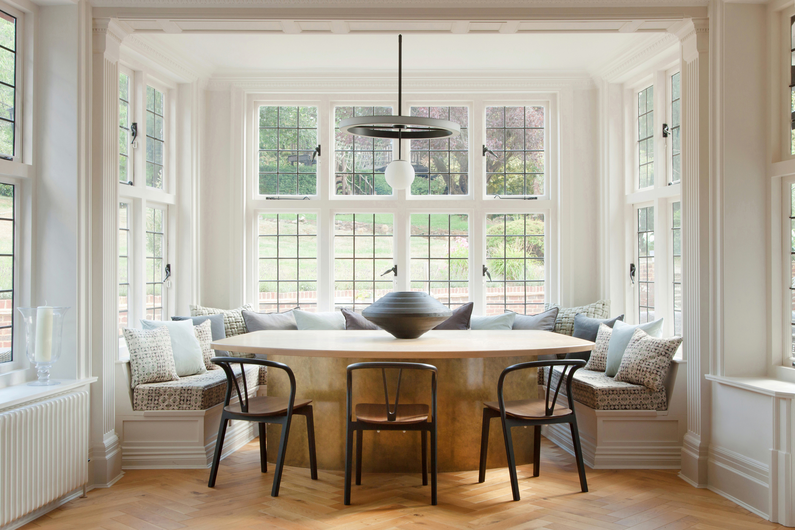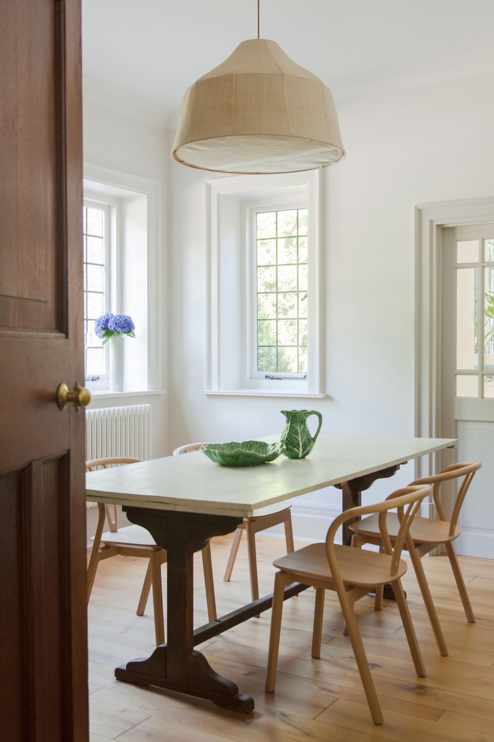 To achieved the desired effect, the designers mixed antique pieces, like a vintage farmhouse table that belonged to the family, with contemporary furniture like these contemporary natural wood chairs by Ercol. The chair design is repeated in another custom dining nook with original lead windows on three sides and a bespoke banquette upholstered in Liberty of London fabric.