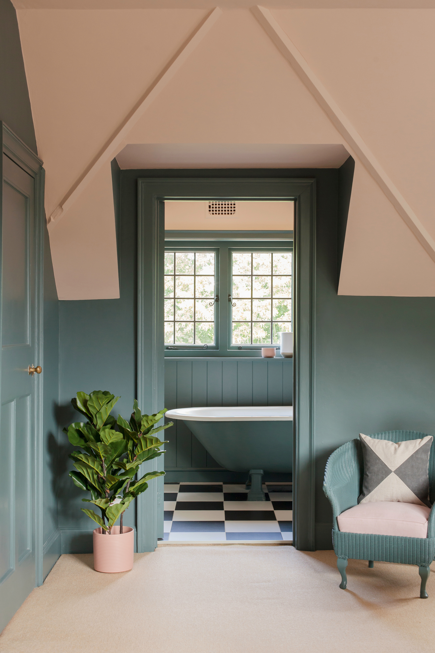 While the master bedroom has warm pink hues, the bathroom sticks to the blue-green theme, with turquoise paneling surrounding the freestanding tub and multiple leafy plants helping to bring the outside in and connect the inside of the home with the surrounding gardens.