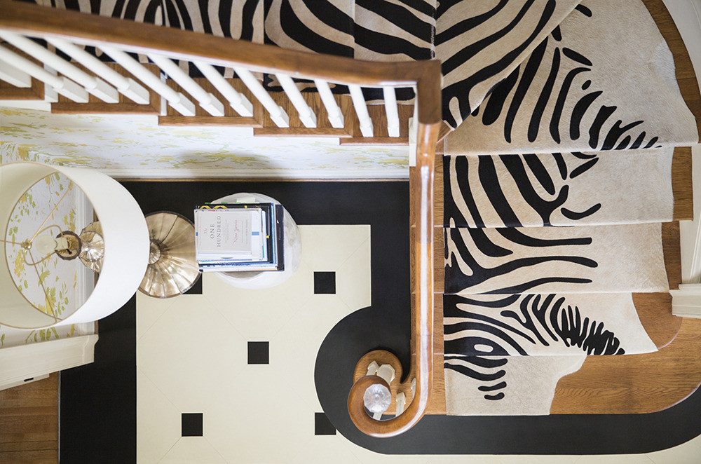 The zebra black on light beige stair runner was made from three hides cut in half.