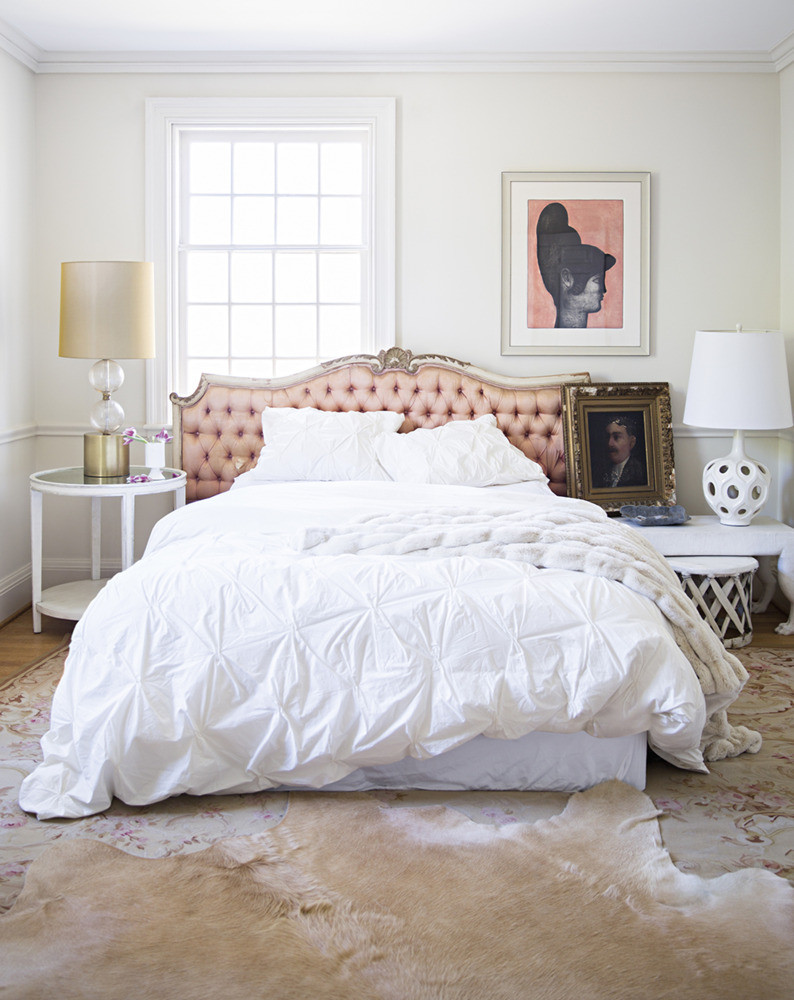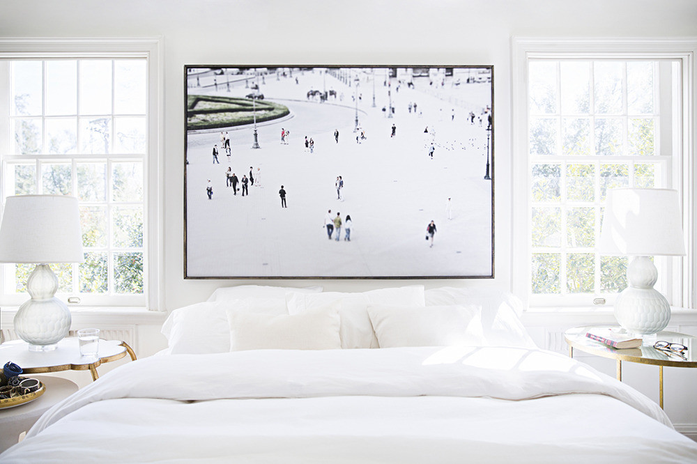 In her bedroom, Sherry wanted to create a white, calm respite. “To give it a twist,” she says. “I installed one of my husband’s photographs from a trip to the Louvre in place of a headboard.”