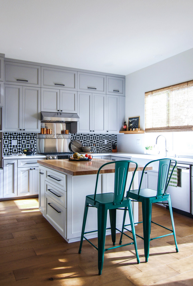 “At that point, we were already going with a pretty blueish grey for the shaker cabinets and a hickory butcher block top for the island and had low maintenance quartz on the counters—all that jived well with the clients, but I wanted to give a nod to their (particularly the wife’s) super vibrant personality and the fun inviting atmosphere she envisioned.”